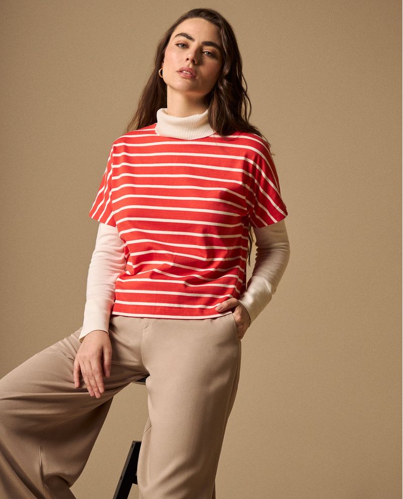 Camiseta roja con rayas blancas horizontales y cuello contrastante que aporta frescura a tus looks casuales. Su tejido de algodón premium garantiza comodidad durante todo el día, mientras que el corte moderno se adapta a diferentes siluetas sin perder forma. Ideal para combinar con jeans, pantalones de vestir o faldas, creando outfits versátiles desde reuniones informales hasta planes de fin de semana.