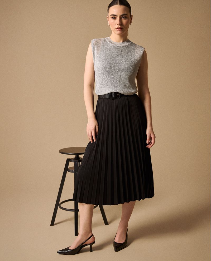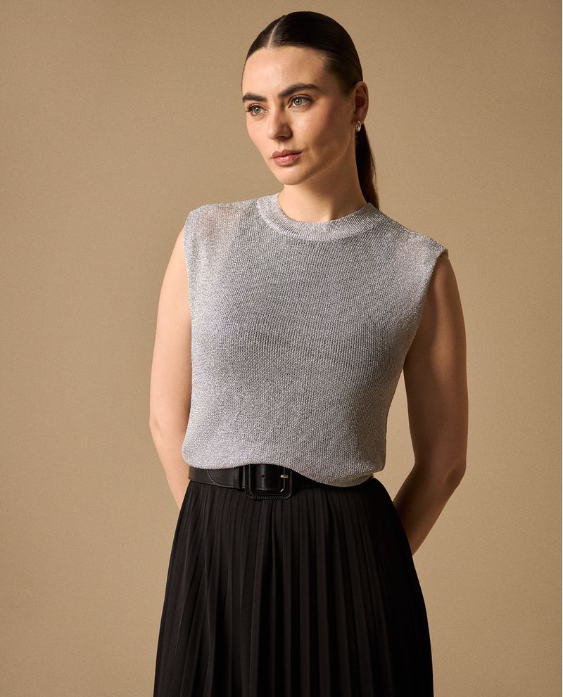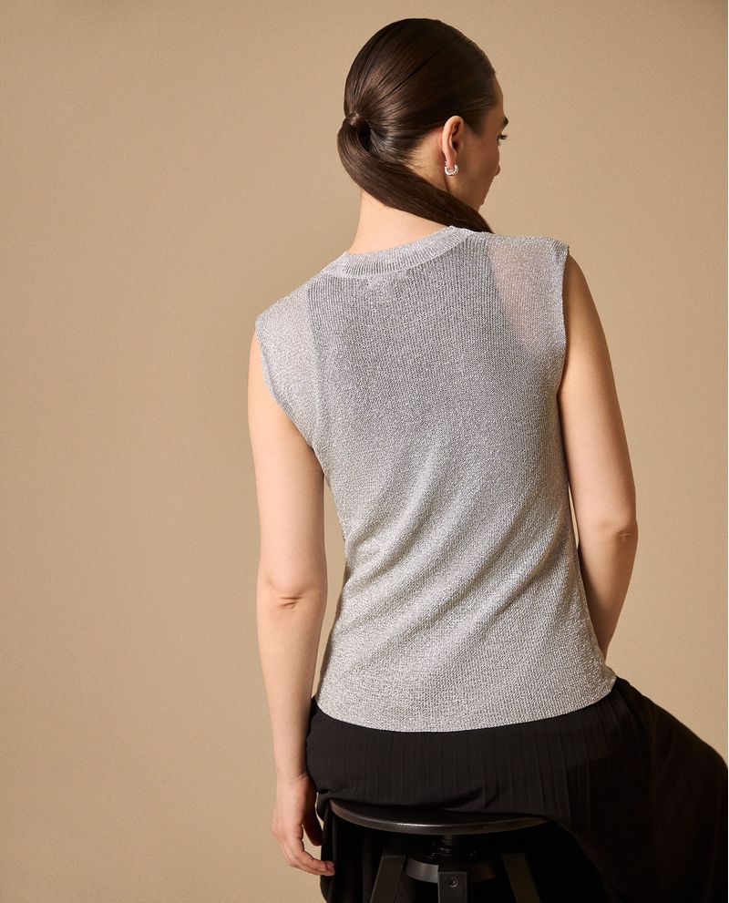 Camisetasin mangas con tejido acanalado que crea un efecto visual sofisticado gracias a sus transparencias estratégicas. Su composición de viscosa y poliéster ofrece caída natural y comodidad durante todo el día, mientras que el diseño minimalista la convierte en una base versátil para múltiples looks. Apta para oficina, eventos casuales y salidas nocturnas.