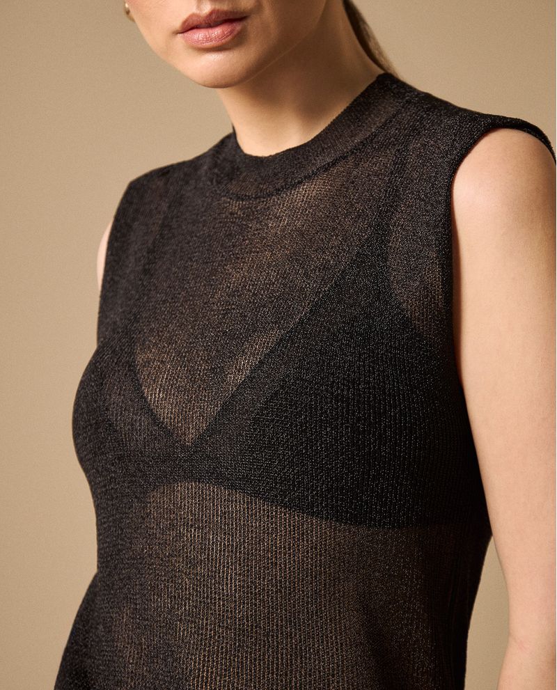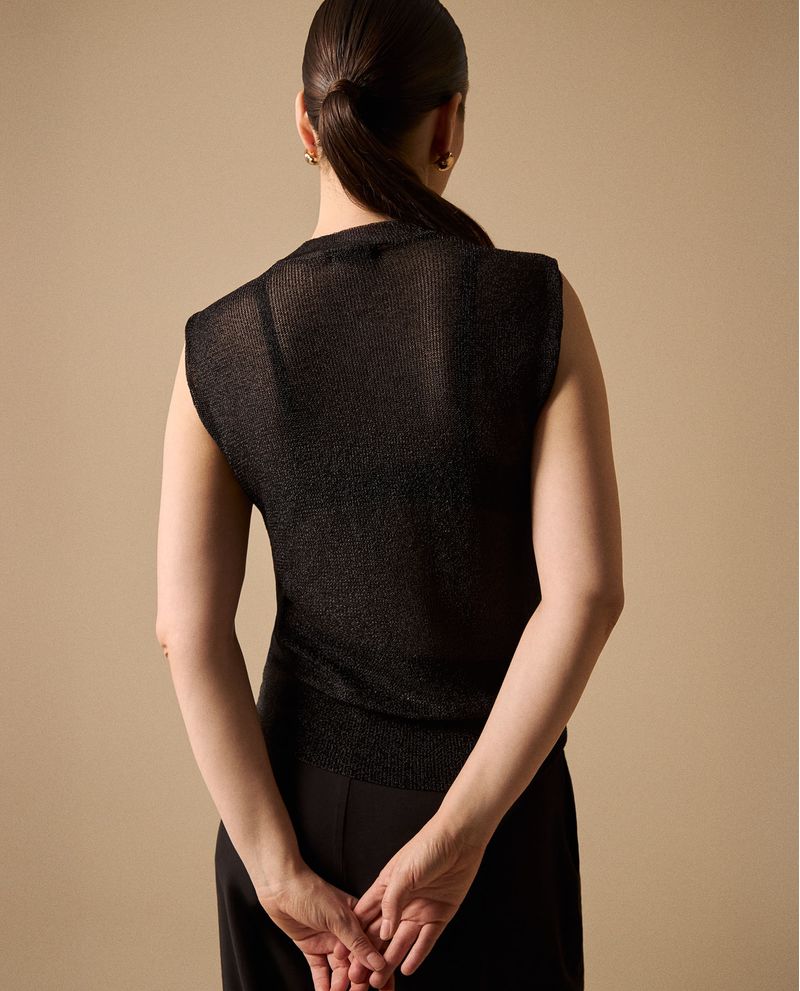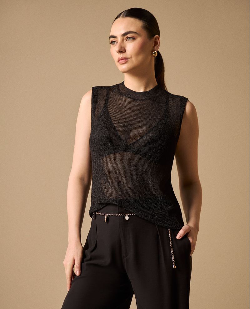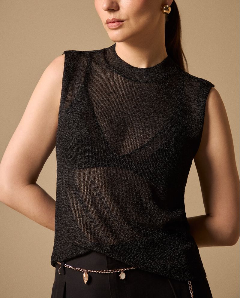 Camisetasin mangas con tejido acanalado que crea un efecto visual sofisticado gracias a sus transparencias estratégicas. Su composición de viscosa y poliéster ofrece caída natural y comodidad durante todo el día, mientras que el diseño minimalista la convierte en una base versátil para múltiples looks. Apta para oficina, eventos casuales y salidas nocturnas.