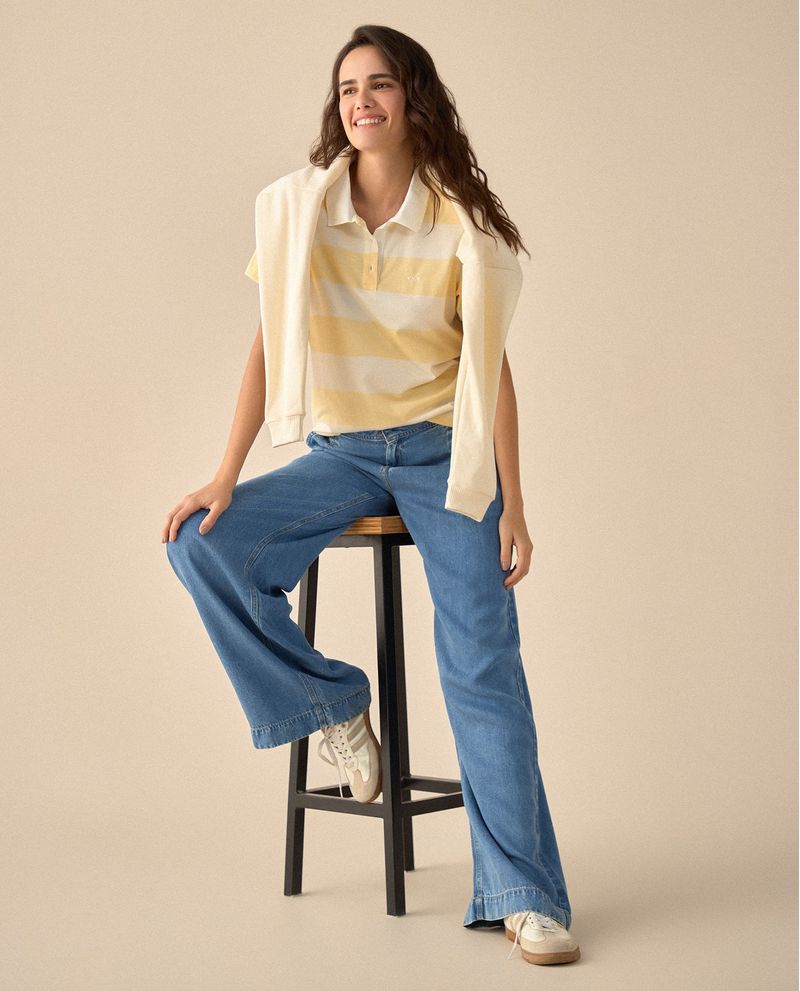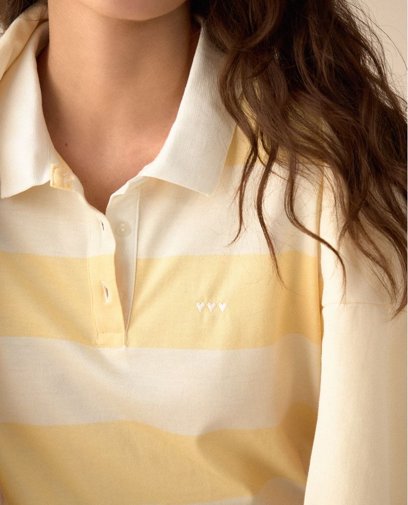 Modernidad y confort en un solo diseño. Con estampado de rayas y bordado en punto corazón, esta camiseta tipo polo de manga corta te hará destacar con su perilla de tres botones y cuello en rib.