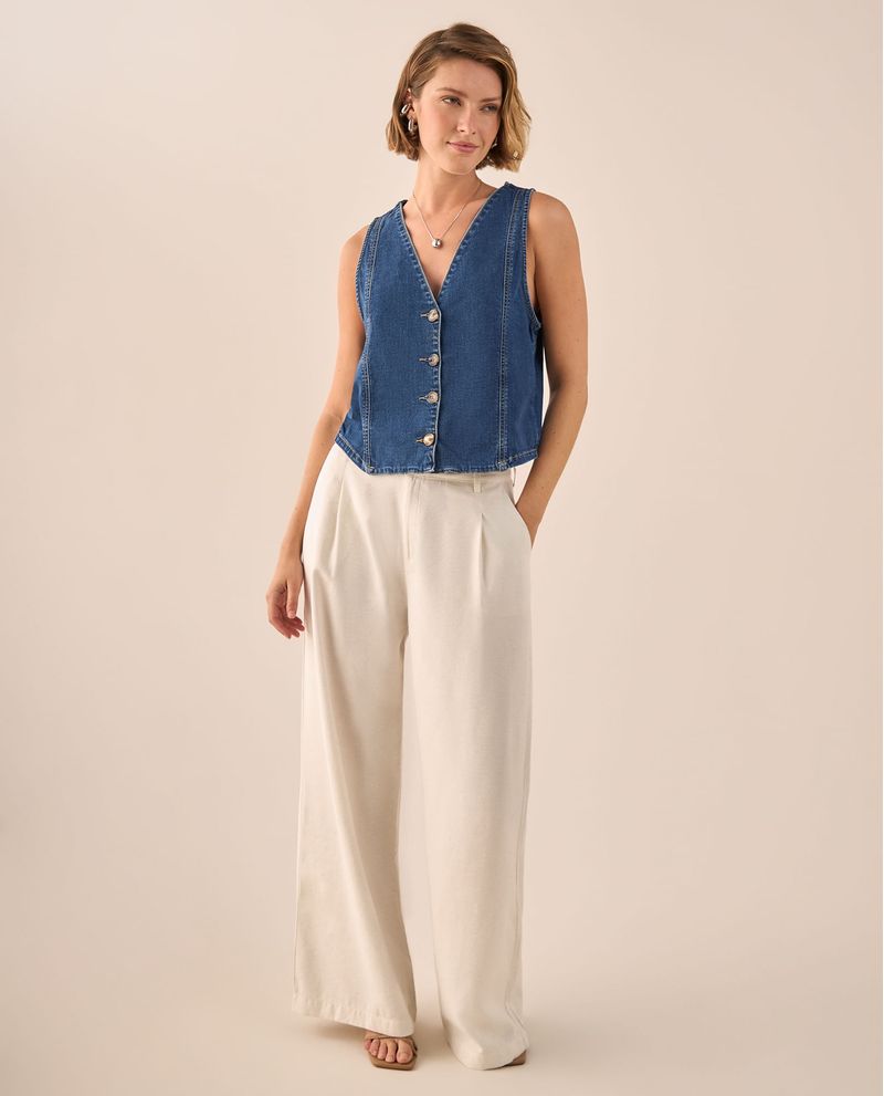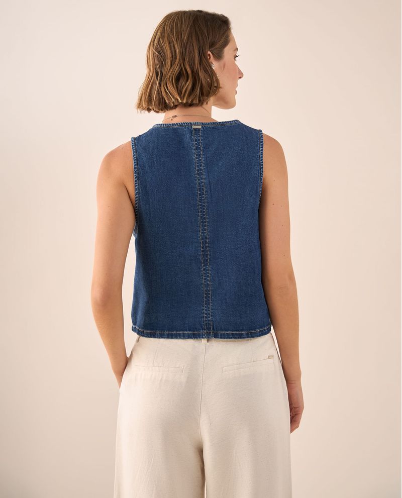 Chaleco denim azul medio con escote V profundo y botones de madera natural que aporta estructura sin peso. Sus costuras contrastantes en amarillo añaden personalidad mientras que el corte ajustado realza la silueta de forma natural. Perfecto para crear capas sofisticadas en cualquier temporada, desde looks casuales hasta conjuntos más elaborados para la oficina.