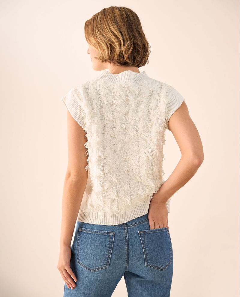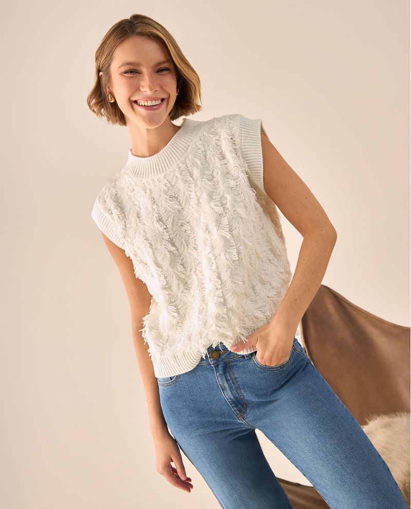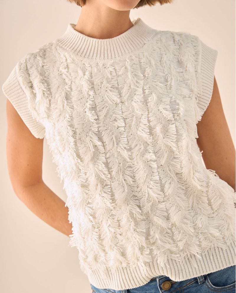 Chaleco blanco con textura de flecos que añade dimensión visual a cualquier outfit. Su diseño sin mangas y cuello redondo lo convierte en la pieza ideal para crear capas sofisticadas, ya que se adapta tanto a looks casuales como más arreglados sin perder comodidad.