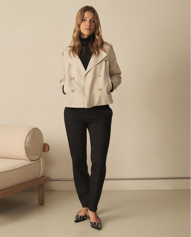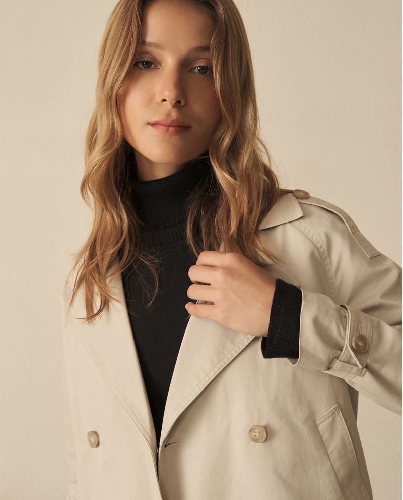 La chaqueta tipo trench corta, con cuello con solapa y ajuste de botones al frente, es un must para tu armario. Los bolsillos laterales y los puños con pasador añaden un toque de distinción a este básico sofisticado.