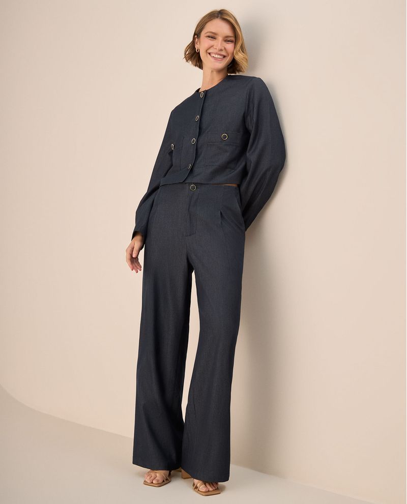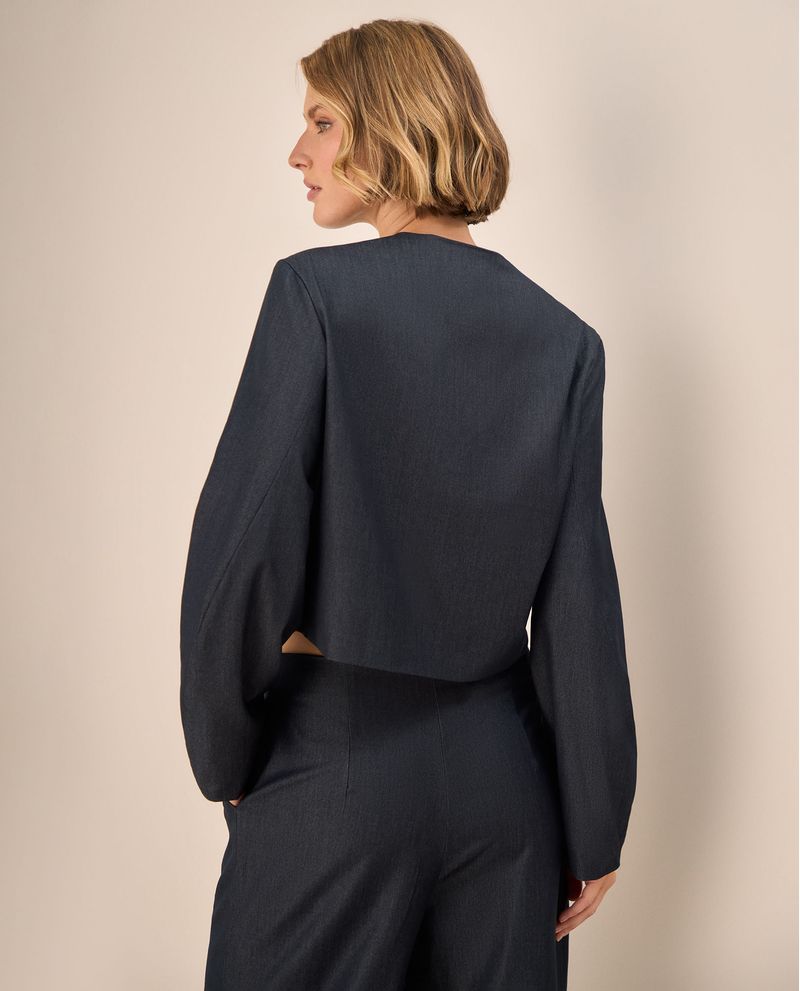 Chaqueta azul oscuro con corte cropped moderno y botones dorados que aportan sofisticación. Su tejido estructurado con forro completo garantiza comodidad y forma impecable, mientras que los bolsillos funcionales añaden practicidad. Diseñada para la mujer que busca elegancia contemporánea en cada ocasión.