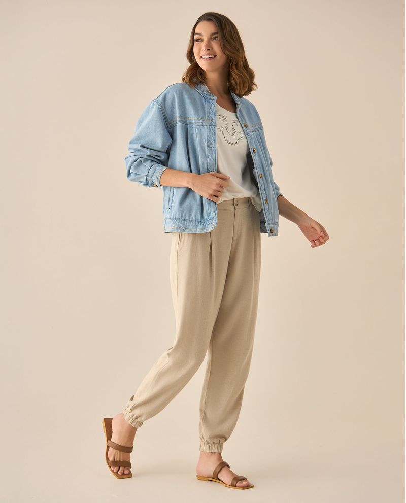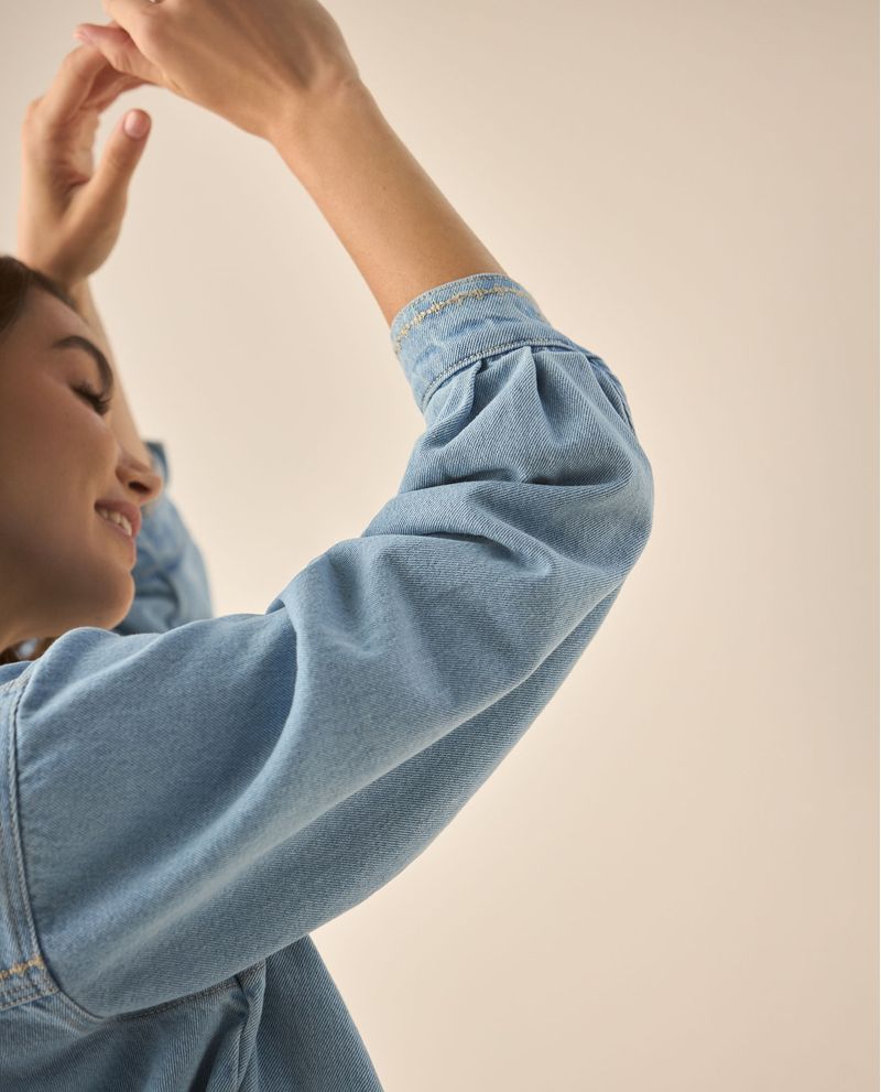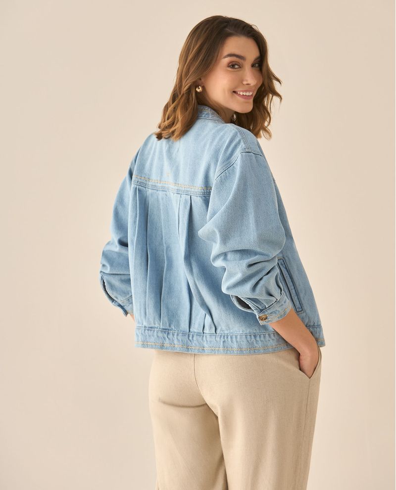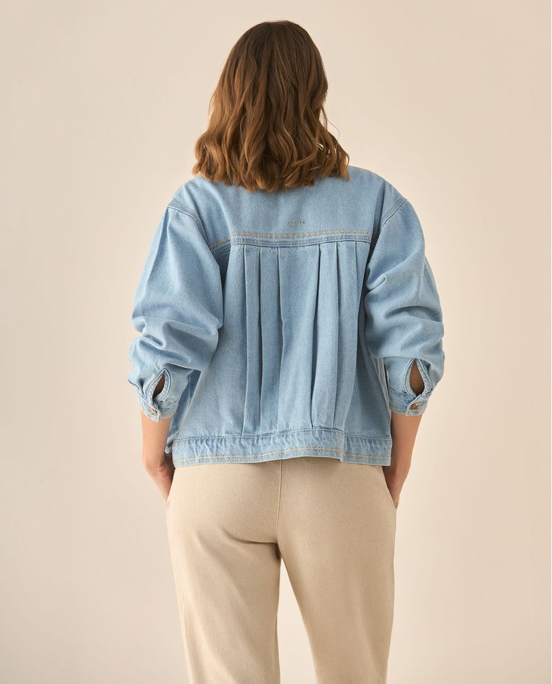 El denim más delicado. Esta chaqueta en tono claro, con cuello nerú, prenses delanteros y tablas en la espalda, se enriquece con mini bordados en puntos clave. Una prenda que combina estructura y vanguardia.