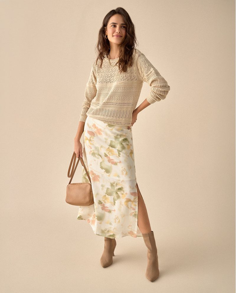 Libre y fluida. Esta falda larga con aberturas en costados y estampado abstracto te dará movimiento y estilo con su forro corto y ajuste en la parte posterior.