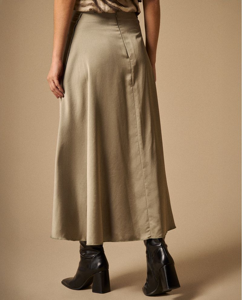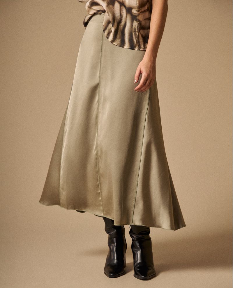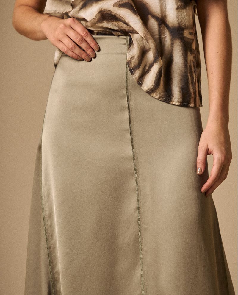 Falda larga gris con acabado satinado y cintura alta que realza la silueta naturalmente. Su corte A-line fluido se adapta a múltiples ocasiones, desde reuniones profesionales hasta cenas especiales, gracias a su caída impecable y construcción premium que mantiene su forma con el uso.