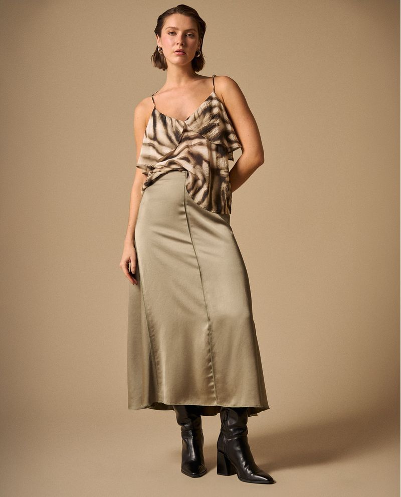 Corte A-line con cintura alta que estiliza la figura y alarga las piernas. El largo midi-maxi es ideal para mujeres de estatura media a alta, creando una silueta sofisticada y proporcionada.