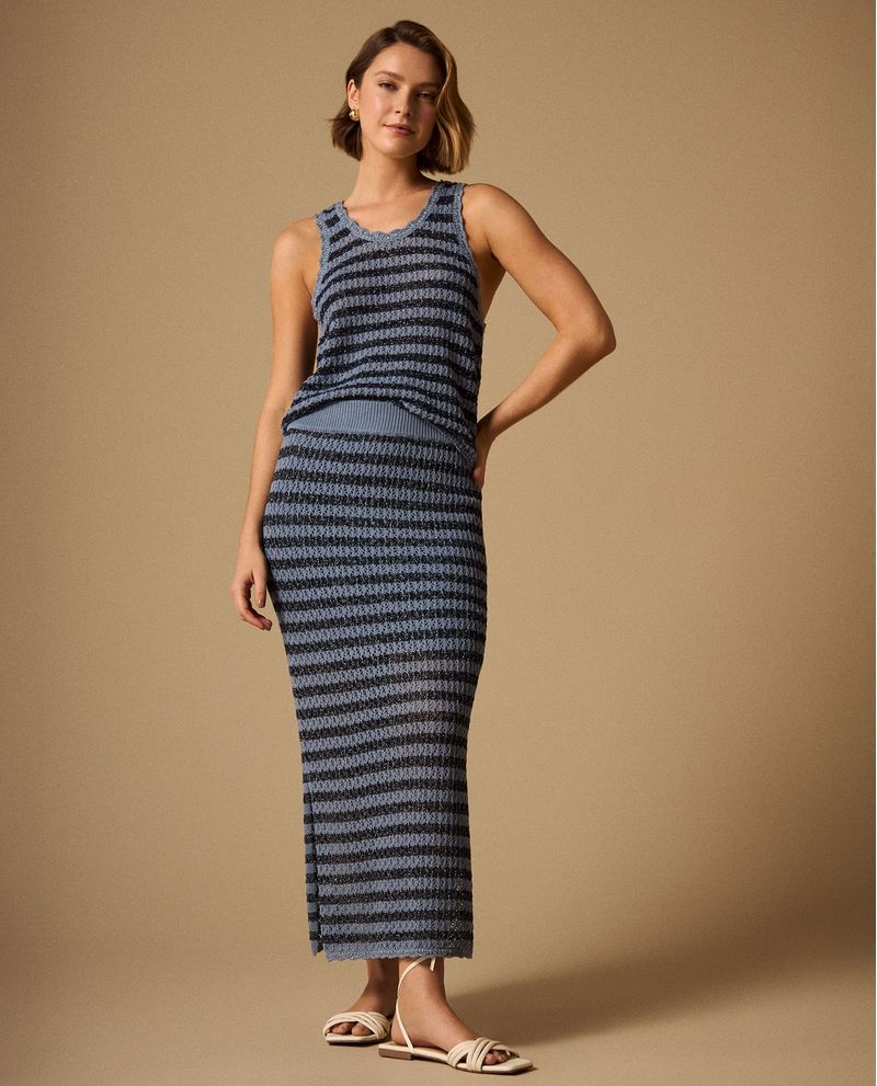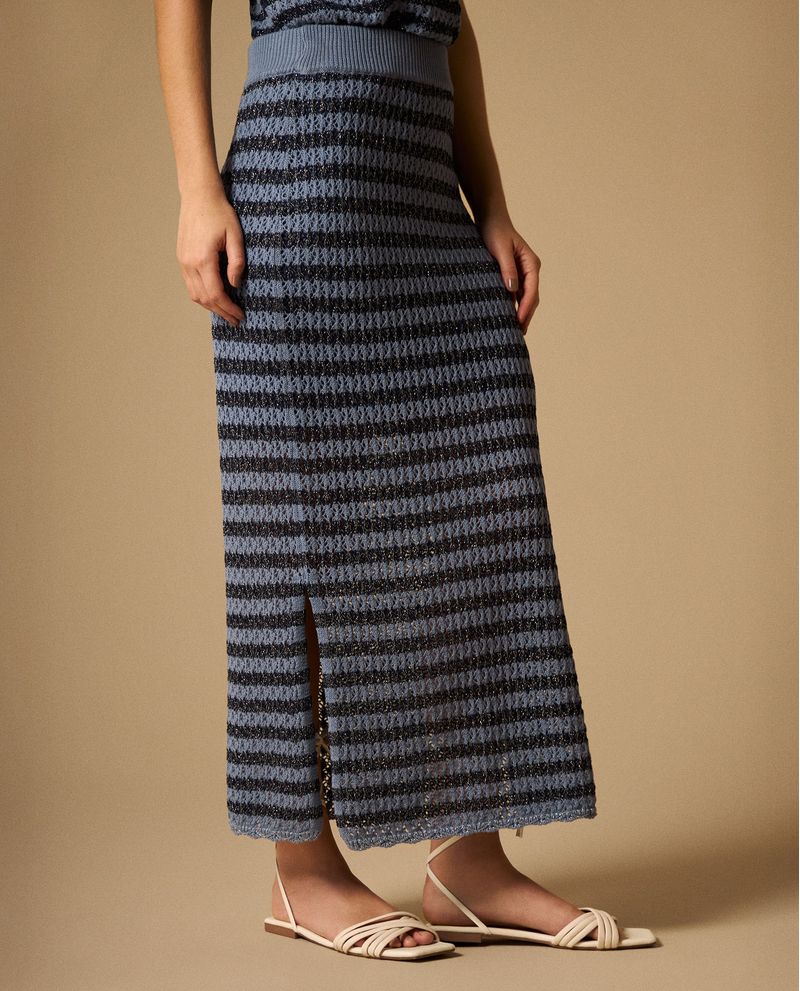 Falda midi azul con rayas horizontales negras y detalles de lurex que aportan un brillo sutil y sofisticado. Su cintura elástica garantiza comodidad durante todo el día, mientras que la abertura lateral facilita el movimiento. Diseñada para acompañarte desde reuniones de trabajo hasta cenas casuales con igual elegancia.