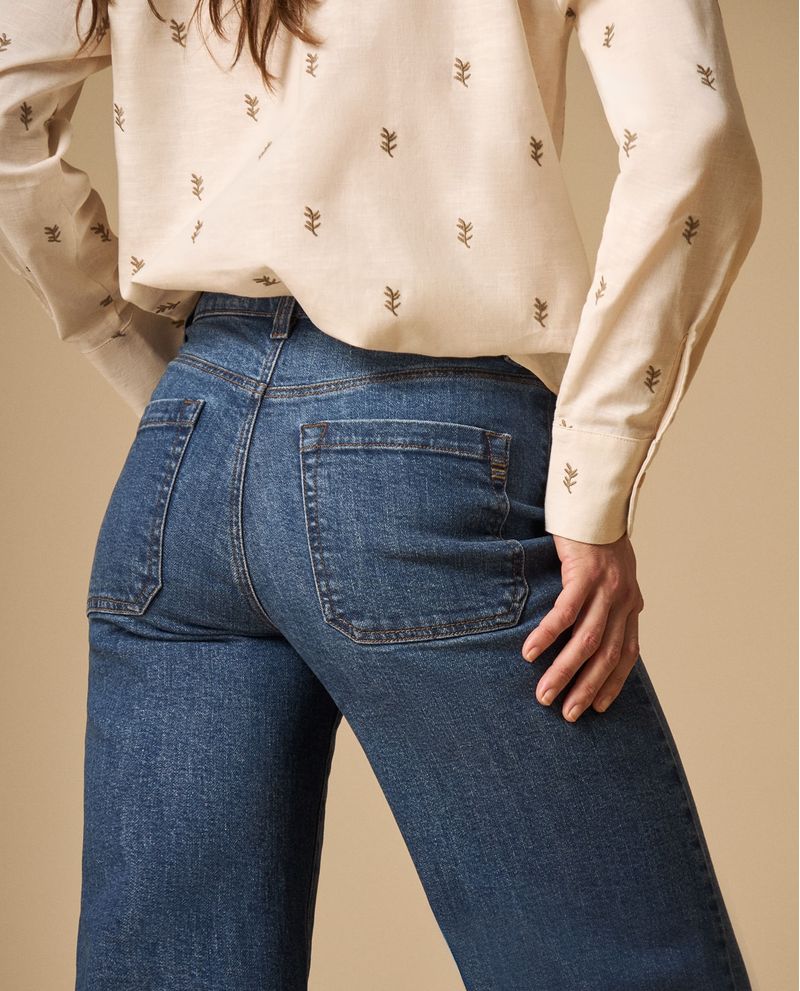 Jean culotte con dobladillo ancho que combina la comodidad del denim tradicional con una silueta contemporánea amplia que estiliza desde la cadera, creando una alternativa sofisticada a los jeans convencionales gracias a su acabado estructurado y largo midi estratégico.