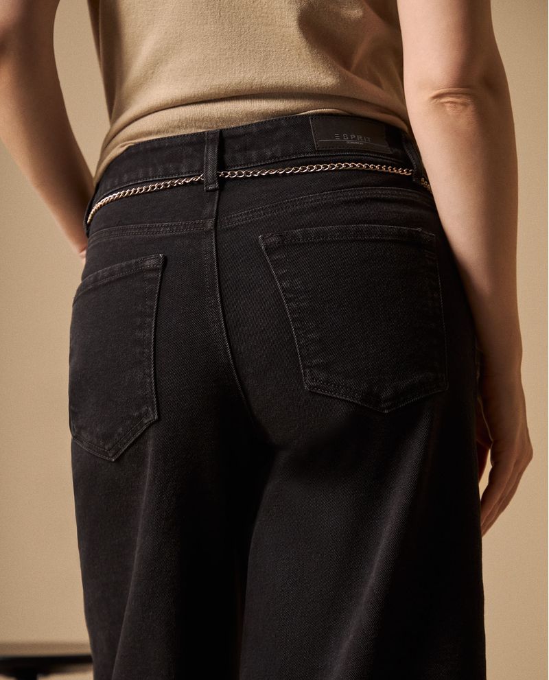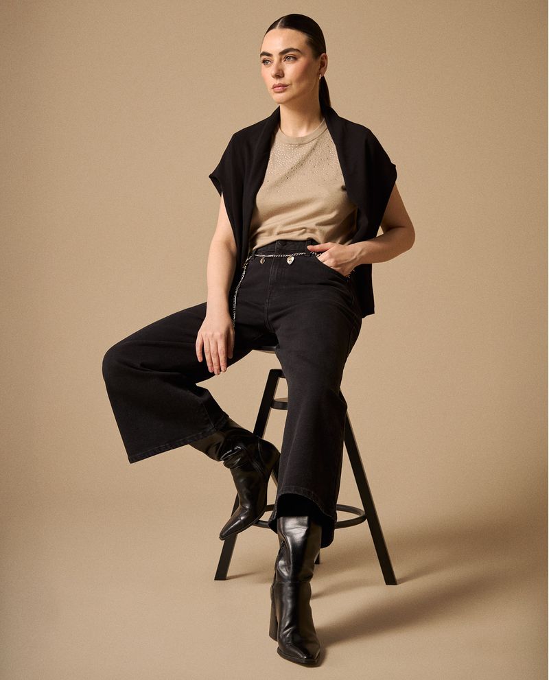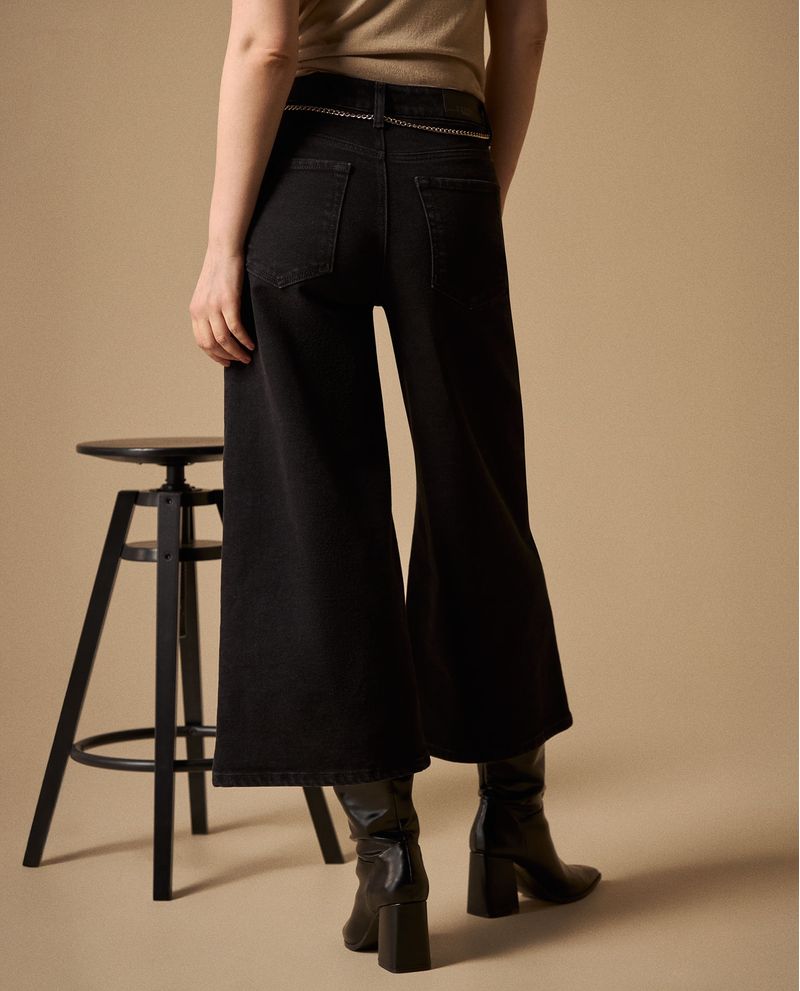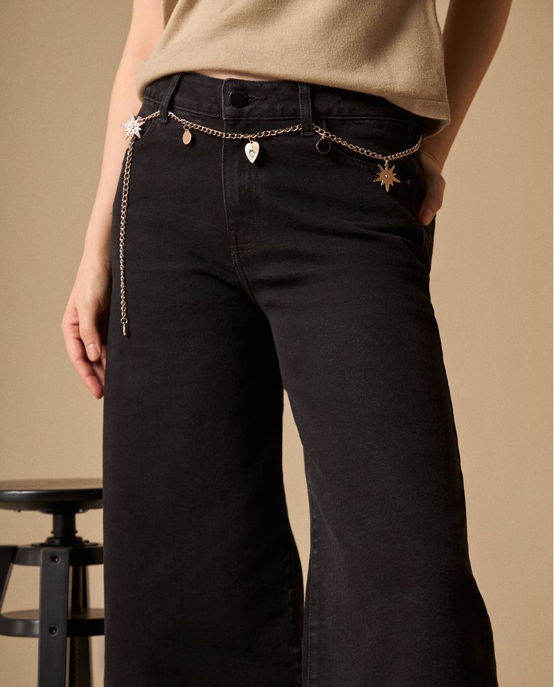 Jean negro en silueta culotte con tiro alto y pierna ancha que estiliza la figura de forma natural. Su cadena decorativa con charms añade un toque contemporáneo, mientras que el corte midi y el acabado raw hem crean un look moderno y sofisticado. Confeccionado en mezcla de algodón y poliéster que garantiza comodidad y mantiene su forma con el uso diario.
