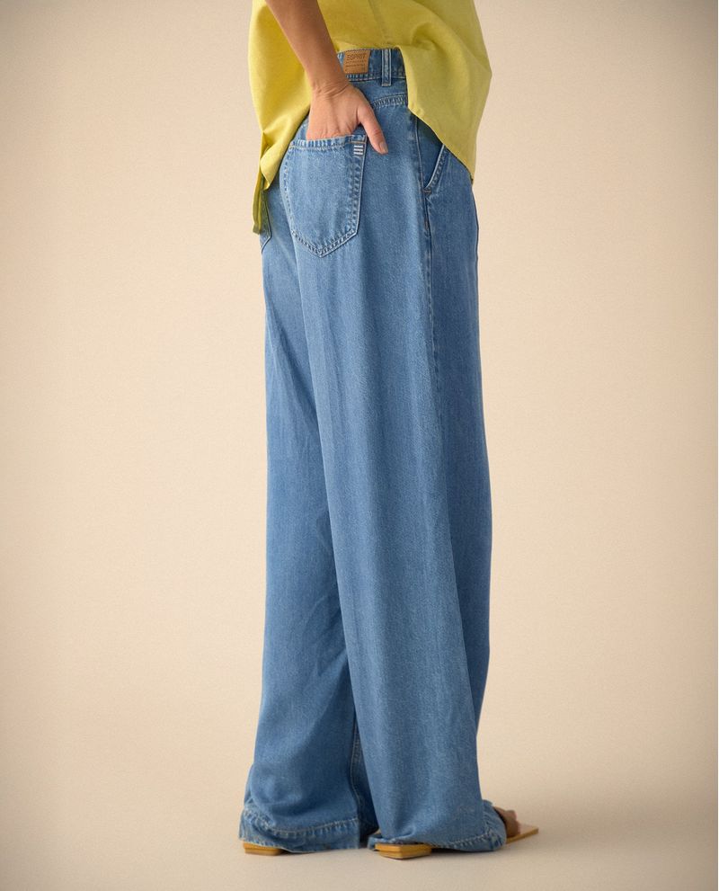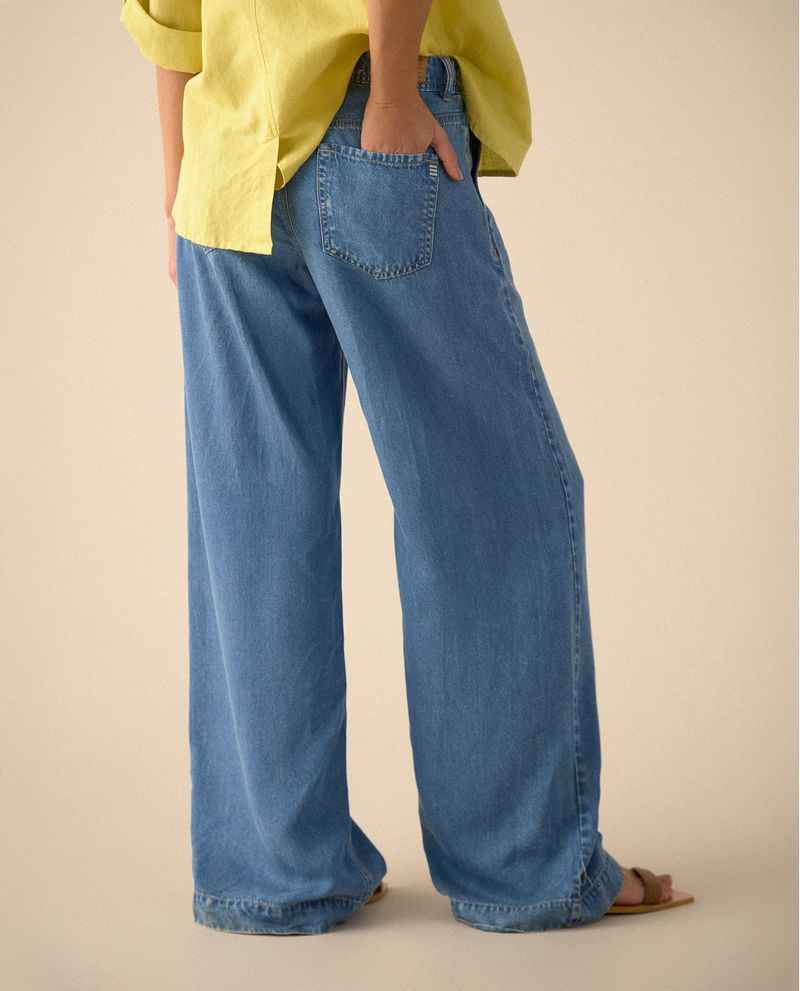 Comodidad y estilo se unen en este jean wide leg de tono medio y denim liviano. Con pinzas en el delantero y bolsillos diagonales, ofrece una silueta amplia y moderna.