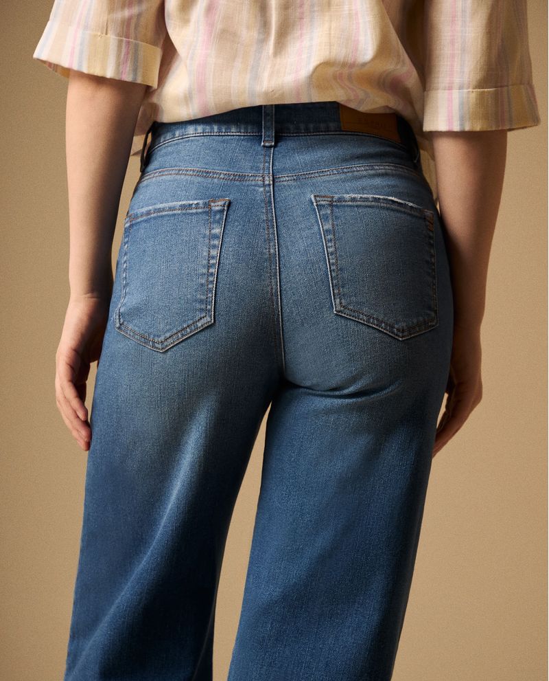 Jean azul medio con silueta flared que realza la figura desde la cadera, gracias a su mezcla única de algodón y cáñamo que aporta estructura sin rigidez. Su tiro medio y pierna ancha crean una línea estilizada, mientras que el acabado deshilachado en el ruedo añade ese toque desenfadado que funciona tanto para el día como para la noche.