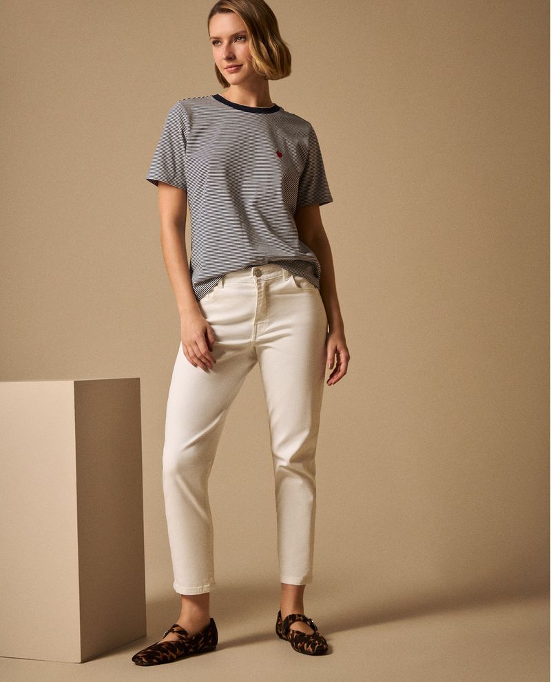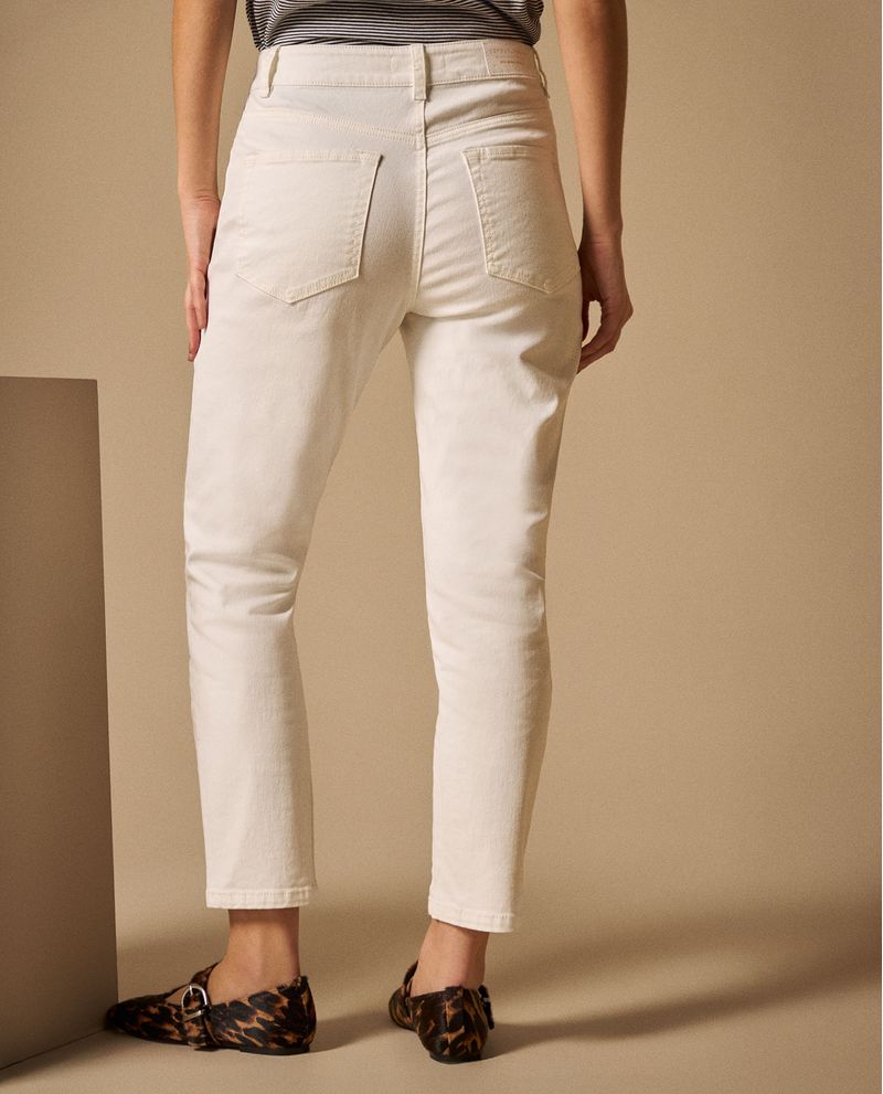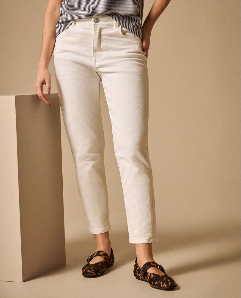 Jean mom en blanco puro con tiro alto que estiliza la silueta y corte relajado que brinda comodidad durante todo el día. Su largo cropped aporta frescura mientras que el fit mom ofrece libertad de movimiento sin sacrificar elegancia. Perfecto para crear looks casuales sofisticados que funcionan desde el café matutino hasta la cena con amigas.