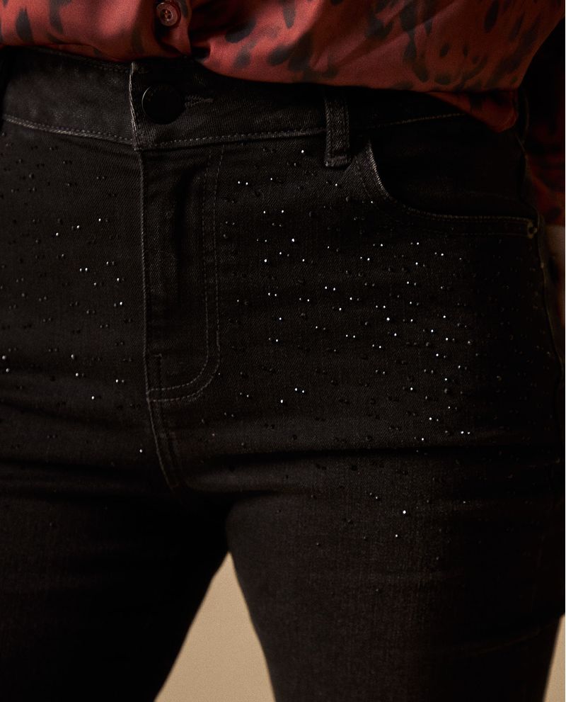 Jean negro con corte slim que se ajusta naturalmente a tu silueta, realzado con aplicaciones brillantes dispersas que capturan la luz de forma sutil. Su mezcla de algodón con elastano ofrece comodidad durante todo el día, mientras que el acabado premium mantiene su apariencia con el uso regular. Funciona tanto para reuniones de trabajo como para cenas especiales, adaptándose sin esfuerzo a tu ritmo diario.