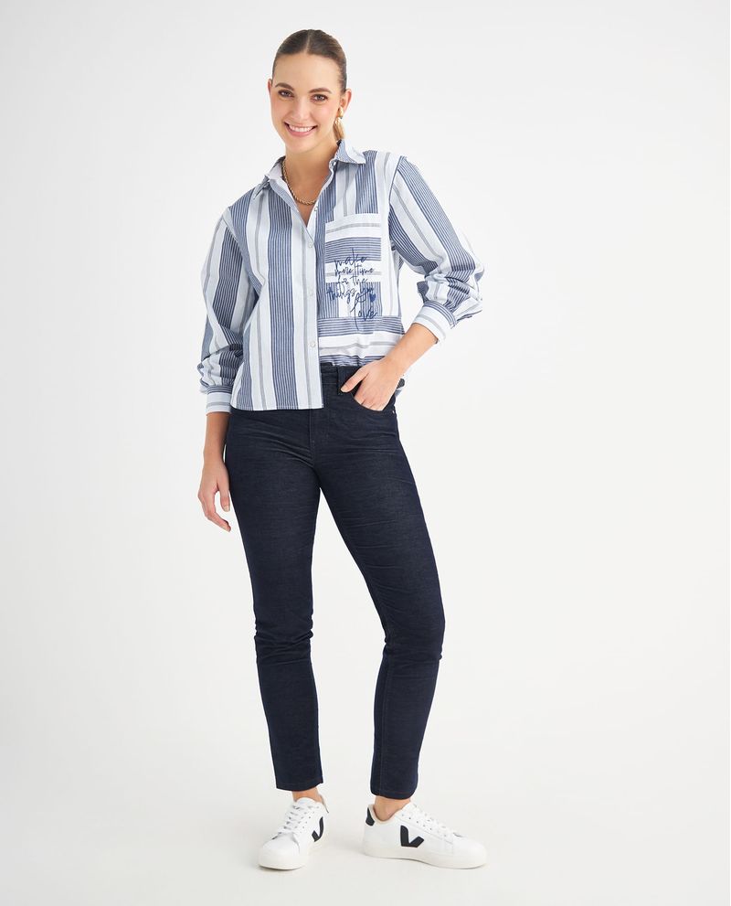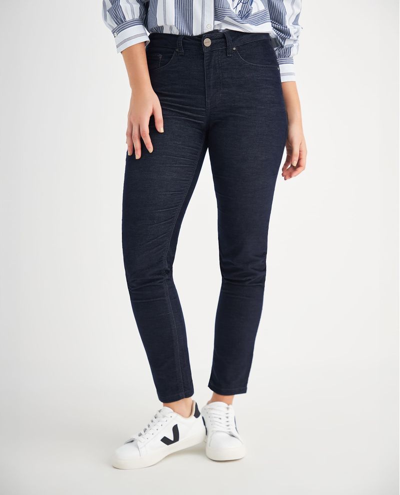 Renueva tu guardarropa con este jean de corte straight fit en un elegante tono oscuro. Con cinco bolsillos para mayor funcionalidad y un ajuste práctico con cierre y botón, son el complemento perfecto para outfits bien pensados. Los pasadores en la pretina te permiten añadir un cinturón si lo deseas, mientras que la tela con efecto gamuza le da un toque distintivo y suave al tacto. Versátil y con estilo, este jean será tu nuevo favorito.