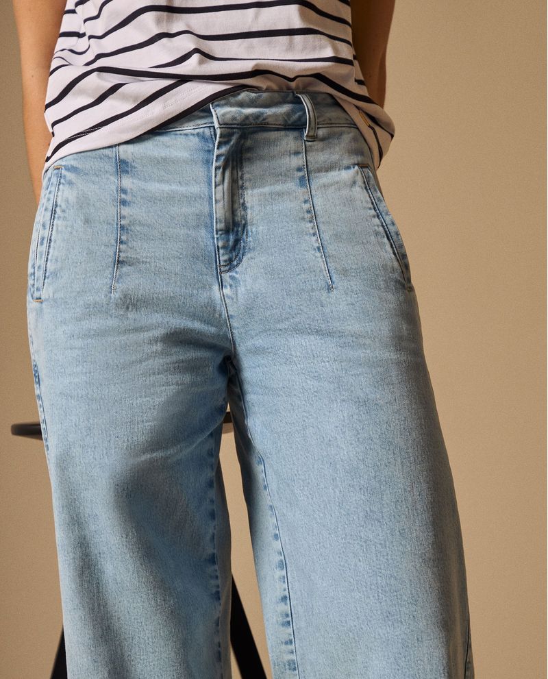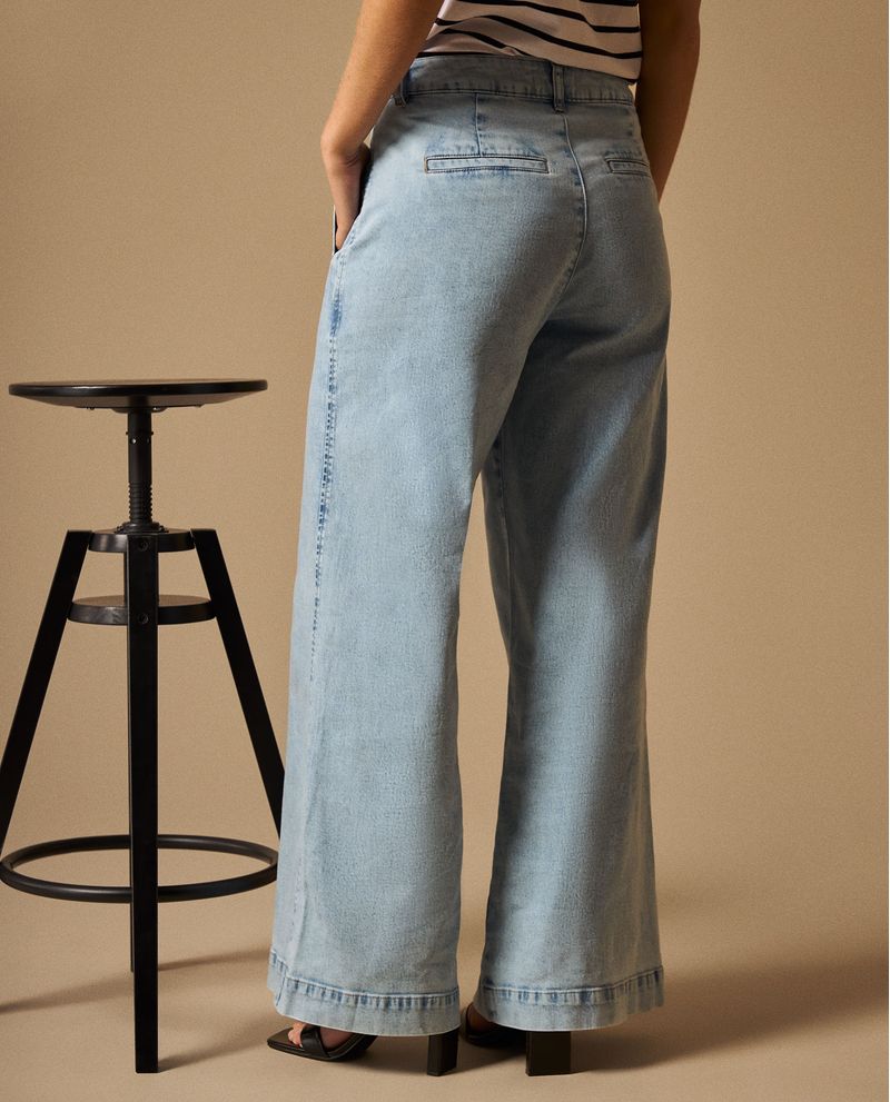 Jean azul claro con silueta wide leg y tiro alto que estiliza la figura gracias a su corte palazzo y acabado stone wash artesanal. Su composición de algodón con mínimo elastano ofrece estructura y comodidad, mientras que el dobladillo con detalle decorativo añade un toque distintivo. Perfecto para crear looks casuales elegantes desde la oficina hasta planes de fin de semana.