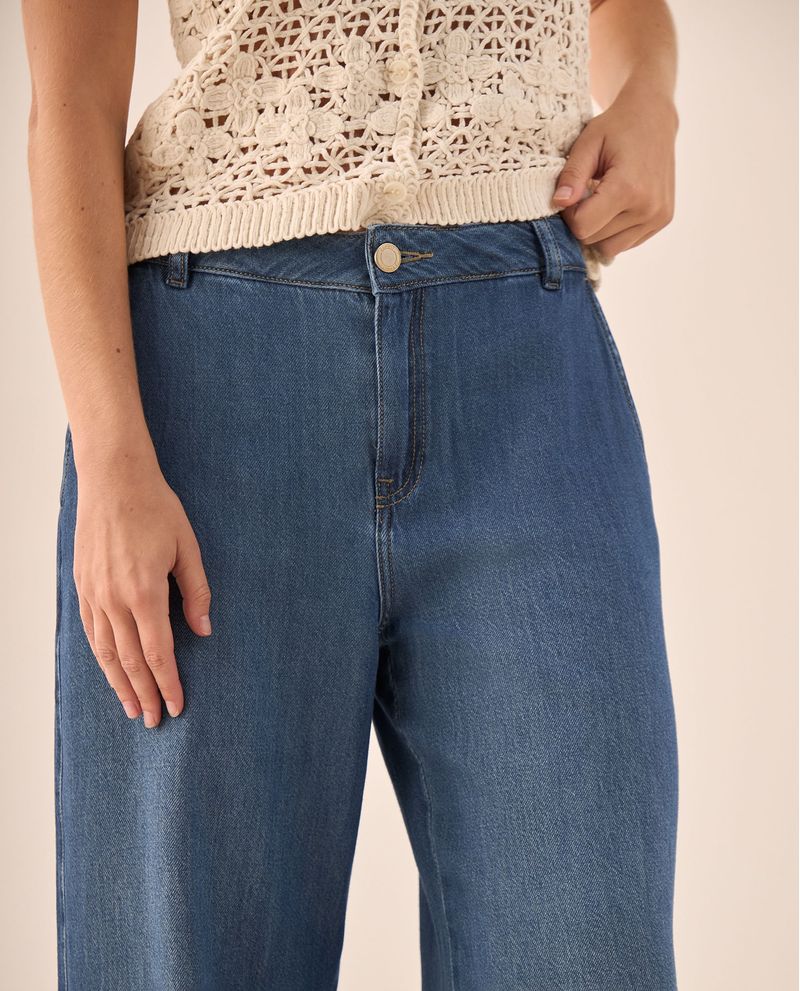 Jean azul medio con silueta wide leg y tiro alto que se adapta cómodamente a tu cuerpo. Su corte amplio permite libertad de movimiento mientras que el botón dorado añade un toque distintivo. Ideal para crear looks casuales elegantes desde el trabajo flexible hasta planes de fin de semana, gracias a su versatilidad para combinar con diferentes estilos de prendas superiores.