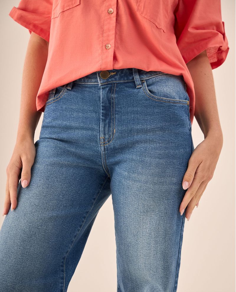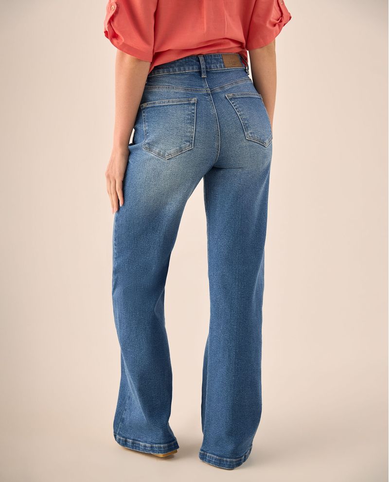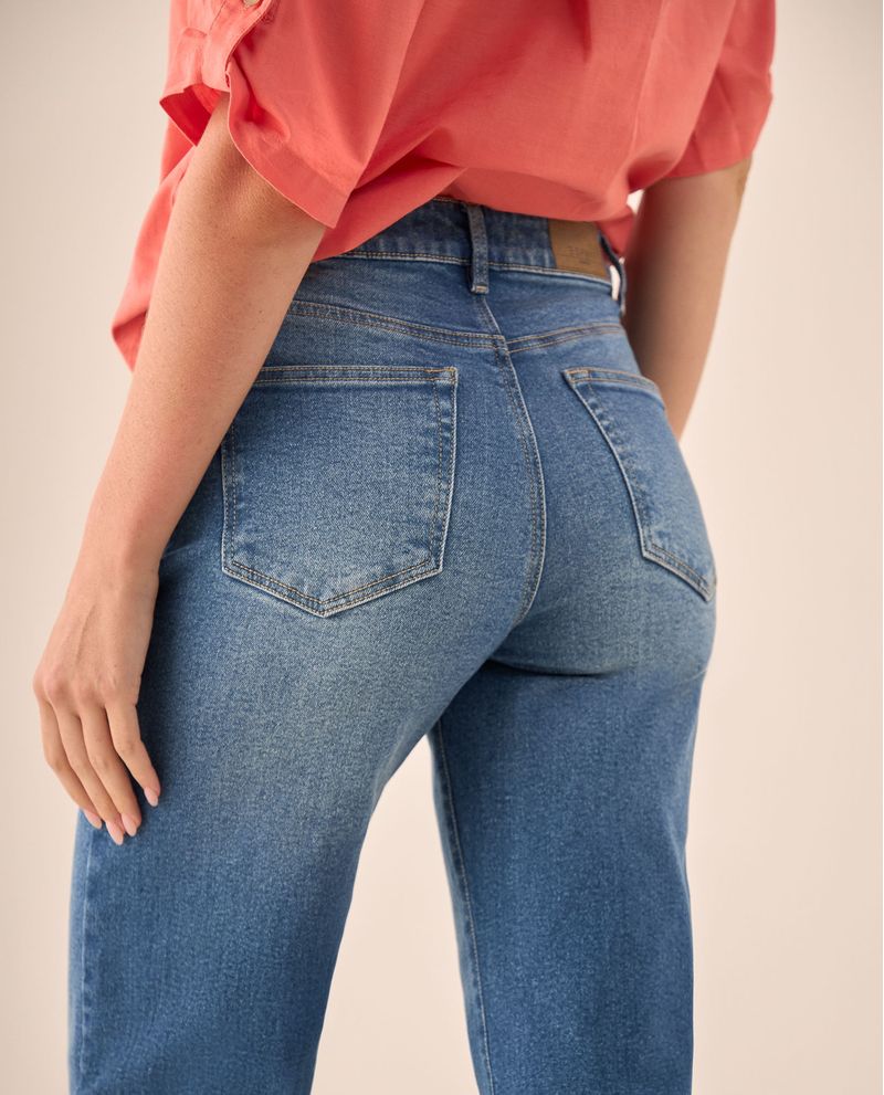 Jean azul medio con silueta wide leg que ofrece comodidad excepcional gracias a su tiro alto y corte amplio desde la cadera. Su lavado uniforme sin desgastes crea un look minimalista y sofisticado, perfecto para quienes buscan un denim versátil que funciona tanto para el día a día como para ocasiones más especiales.