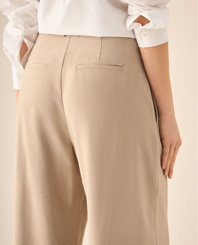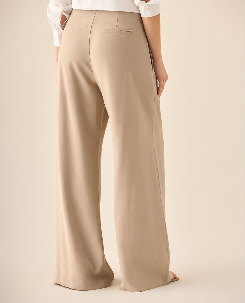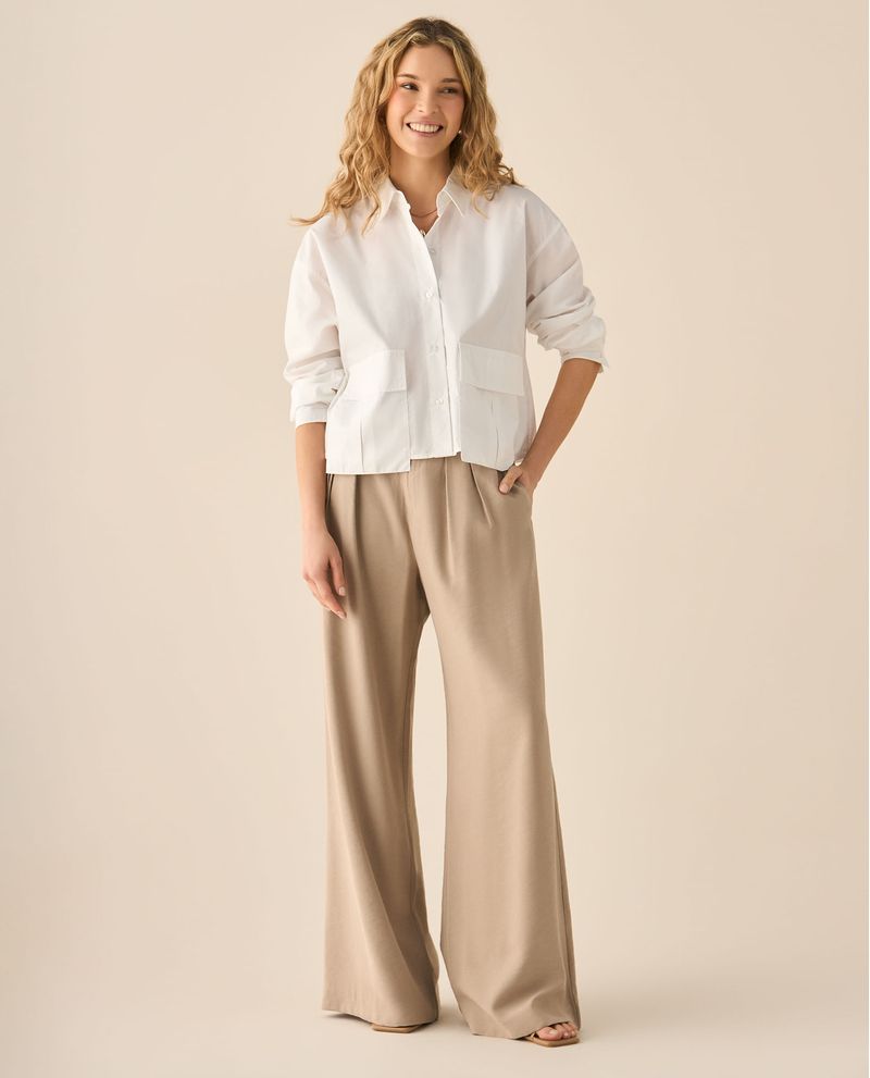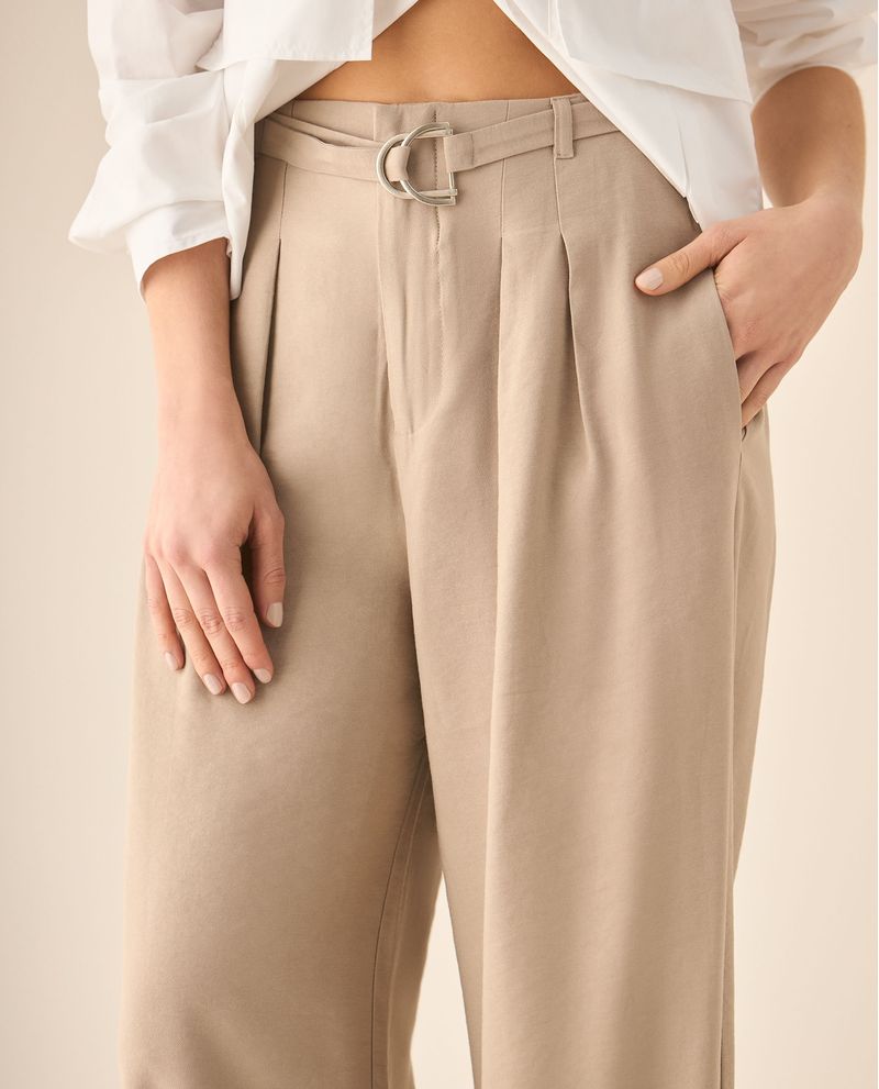 Sofisticación relajada. Este pantalón de silueta amplia, con prenses en el delantero y cinturón con hebilla, aporta estructura y ligereza. Es perfecto para combinar con camisas delicadas y destacar con elegancia discreta.