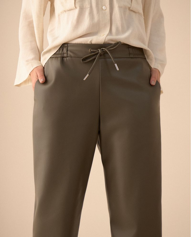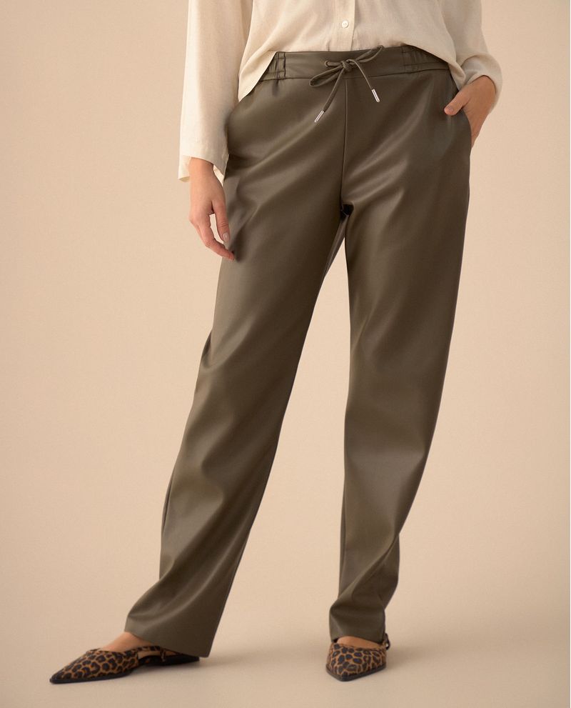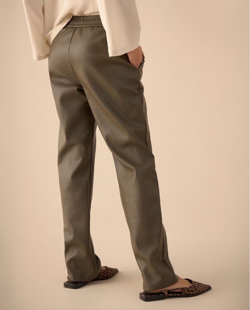 Con un toque rebelde, este pantalón efecto cuero se caracteriza por su pretina elástica con jareta y bolsillos diagonales, creando una silueta moderna y cómoda para el día o la noche.