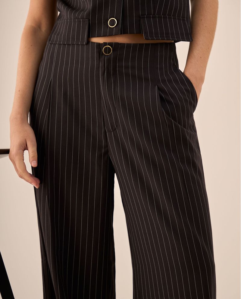 Pantalón palazzo negro con rayas diplomáticas blancas que combina la elegancia de la sastrería clásica con la comodidad moderna. Su tiro alto estiliza la silueta mientras que las rayas verticales aportan sofisticación atemporal, perfecto para transitar de la oficina a eventos sociales con el mismo aplomo. El botón dorado añade un toque distintivo que completa este diseño versátil.