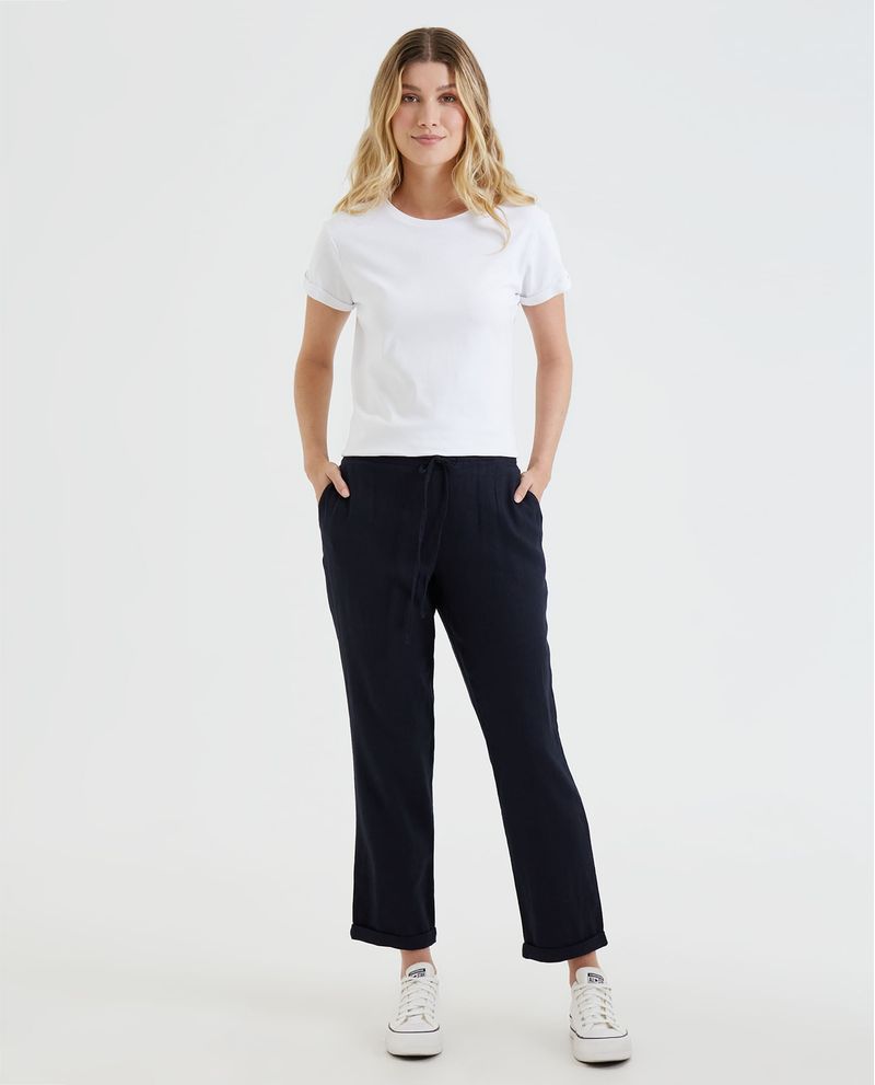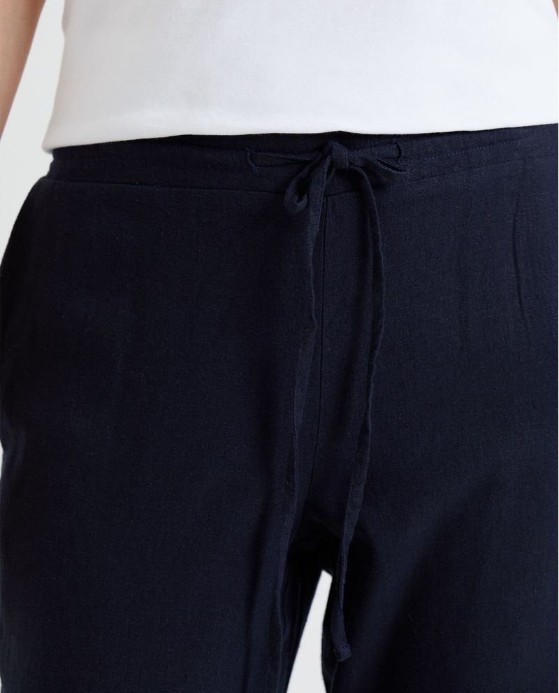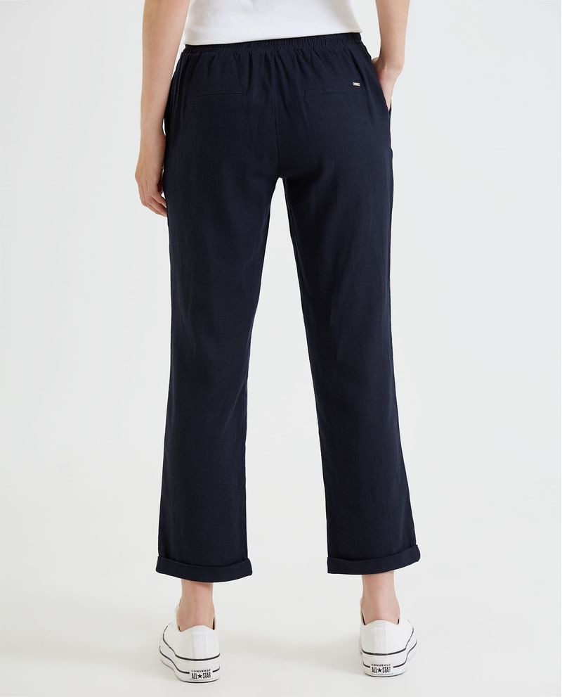 Pantalón de tiro medio, con bota recta. Tanto para el uso diario, como para las vacaciones: este Pantalón fluido confeccionado en mezcla de lino y viscosa es simplemente imprescindible en cualquier guardarropa. Lo diseñamos con la cintura elástica con cordones ajustables, para que elijas el nivel de comodidad que prefieras según la ocasión. Lo completamos con bolsillos laterales en diagonal y doblez en el ruedo.