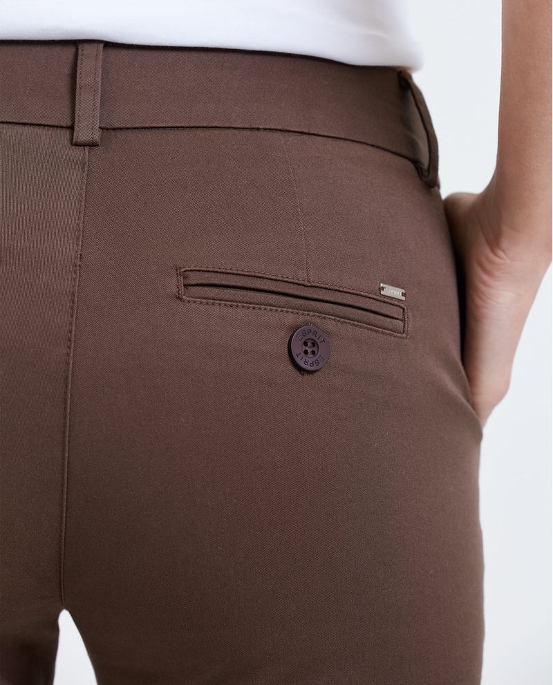 Pantalón de tiro medio, con bota recta. El corte clásico y el diseño atemporal de este Pantalón estilo chino combina absolutamente con lo que le pongas. Lo confeccionamos en algodón ligeramente elástico por lo que te brinda mayor flexibilidad y te ofrece una silueta mucho más femenina. Se completan con trabillas en la cintura, bolsillos decorativos y ajuste con cierre y ganchos ocultos.