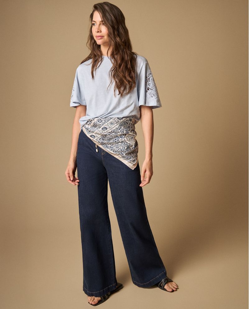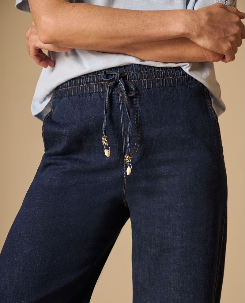 El denim suave abraza tu cintura con la elasticidad justa mientras que las piernas amplias permiten libertad total de movimiento. La textura del tejido es resistente pero flexible, con costuras que se sienten sólidas al tacto. El cordón ajustable añade esa sensación de personalización que se adapta a tu comodidad durante todo el día.