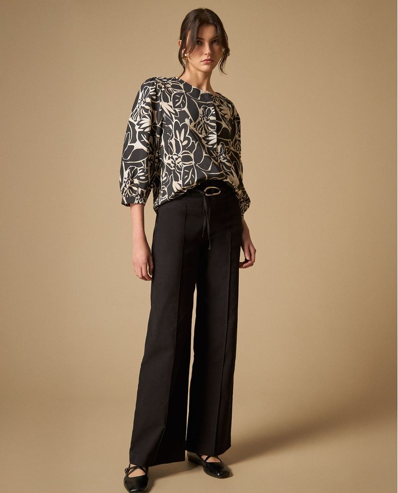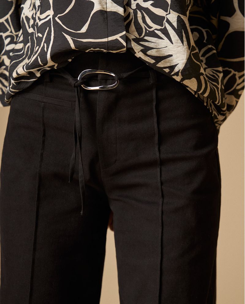 Pantalón wide leg con cordón ajustable que redefine la elegancia contemporánea gracias a su corte fluido que se mueve contigo y su sistema de ajuste personalizable mediante cordón con hebilla metálica distintiva. La cintura alta estiliza la silueta mientras que las piernas amplias crean esa caída envolvente que distingue los diseños de calidad superior.