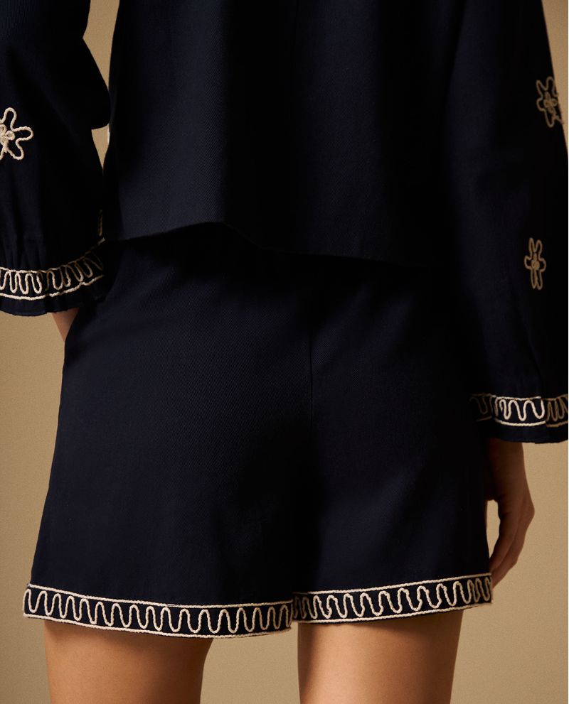 Short azul oscuro con bordados florales blancos que aportan personalidad artesanal a tu look casual. Su cintura elástica con cordón ajustable garantiza comodidad durante todo el día, mientras que los detalles bordados a mano crean un estilo único y sofisticado. Ideal para salidas informales, vacaciones o fines de semana cuando buscas comodidad sin sacrificar estilo.