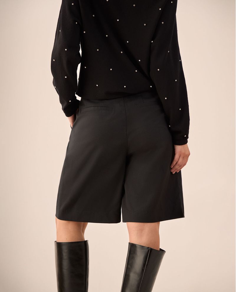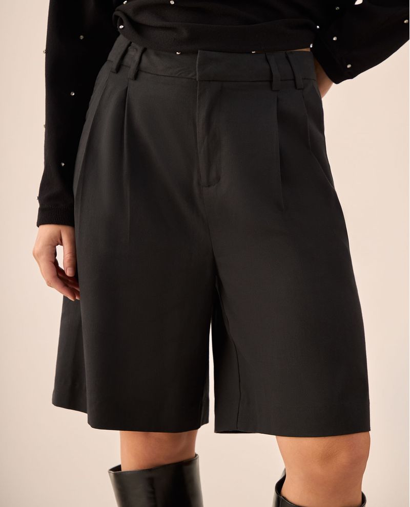 Shorts negros con cintura alta y pliegues frontales que estilizan la silueta mientras aportan sofisticación a cualquier look. Su mezcla de Tencel y algodón ofrece transpirabilidad natural, además el corte wide leg proporciona comodidad sin sacrificar elegancia. Ideales para oficina, eventos casuales y fines de semana urbanos.