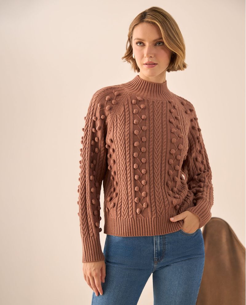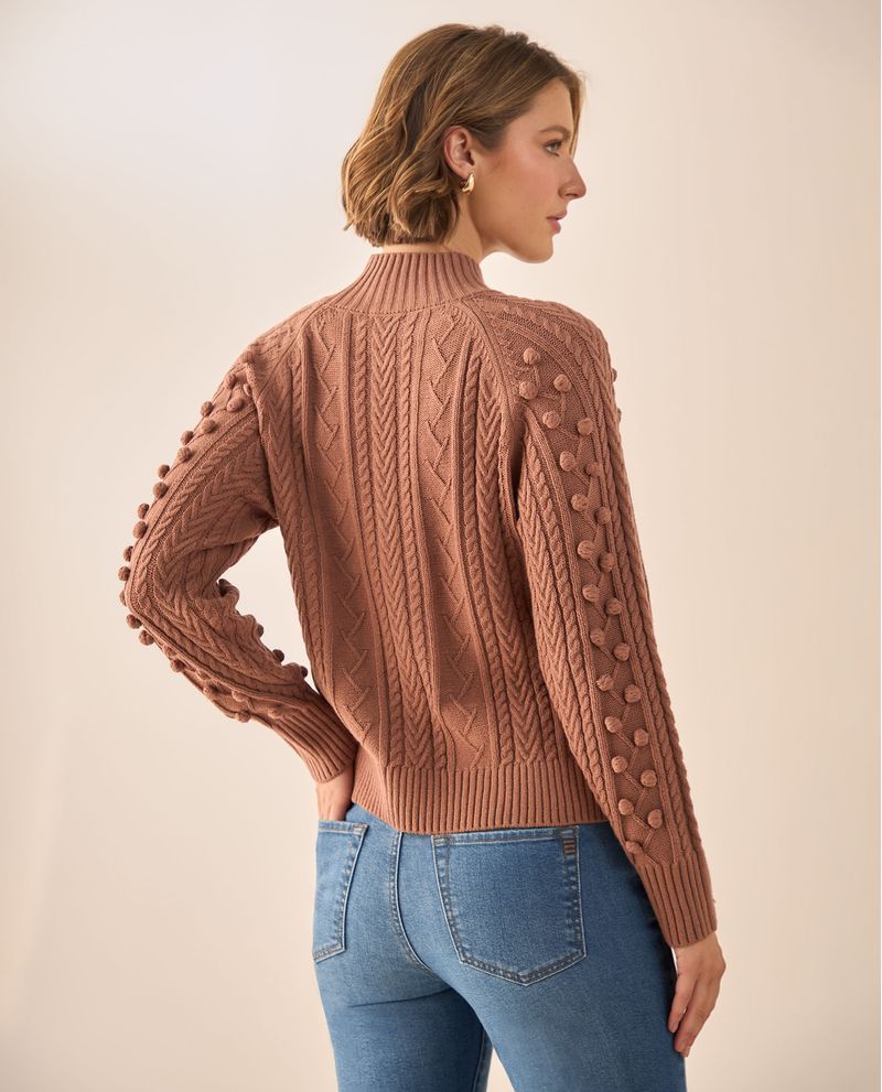 Suéter Café con Pompones y Trenzas Tejidas