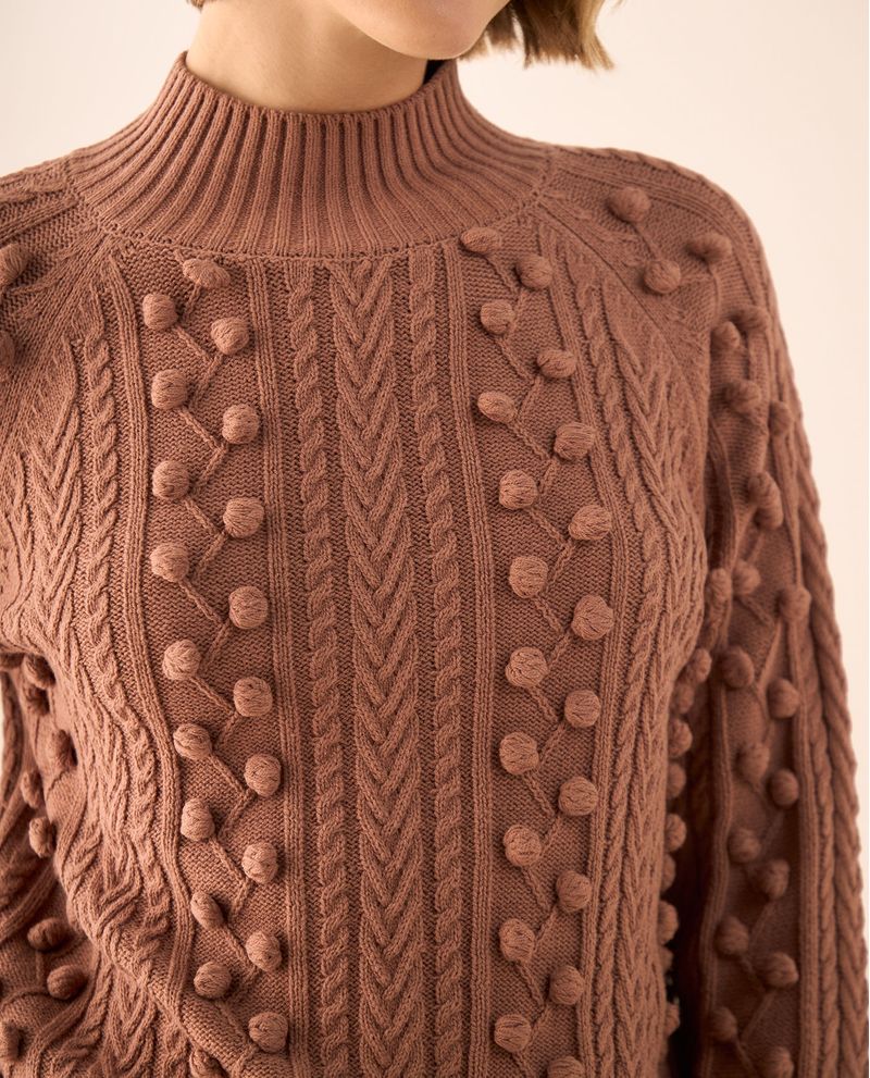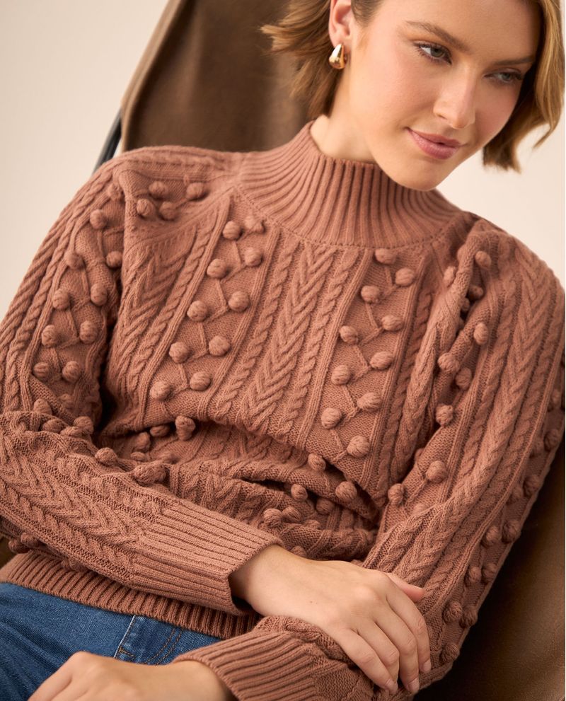 Suéter café ladrillo medio con pompones tridimensionales y trenzas tejidas que crean una textura única y sofisticada. Su cuello alto acanalado y construcción en punto ofrecen calidez y comodidad, mientras que los detalles artesanales lo convierten en una pieza conversacional. Ideal para ocasiones donde quieres destacar con elegancia casual, desde reuniones creativas hasta cenas especiales.