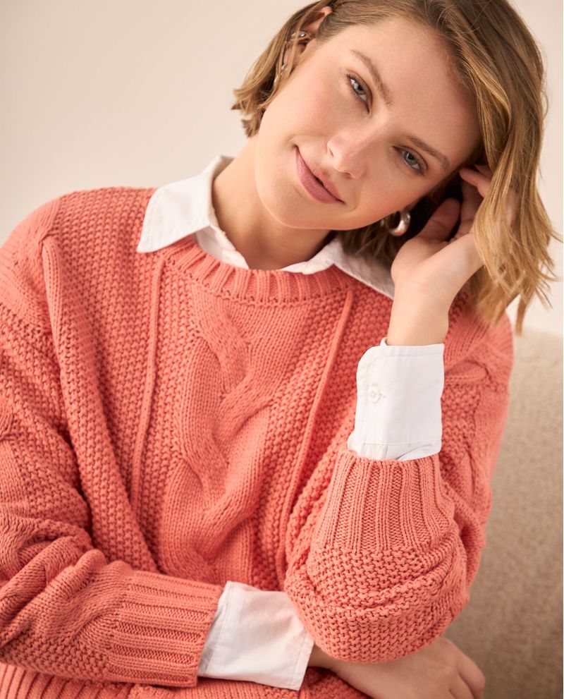 Suéter rosa coral con tejido cable que combina trenzas frontales y posteriores en una mezcla de algodón y acrílico, mientras que su corte regular se adapta cómodamente a diferentes siluetas. Su construcción de punto medio lo hace transpirable para uso diario, además de mantener su forma con el lavado regular. Perfecto para crear looks casuales elegantes desde la oficina hasta reuniones informales, ya que el color coral aporta calidez sin ser demasiado llamativo.
