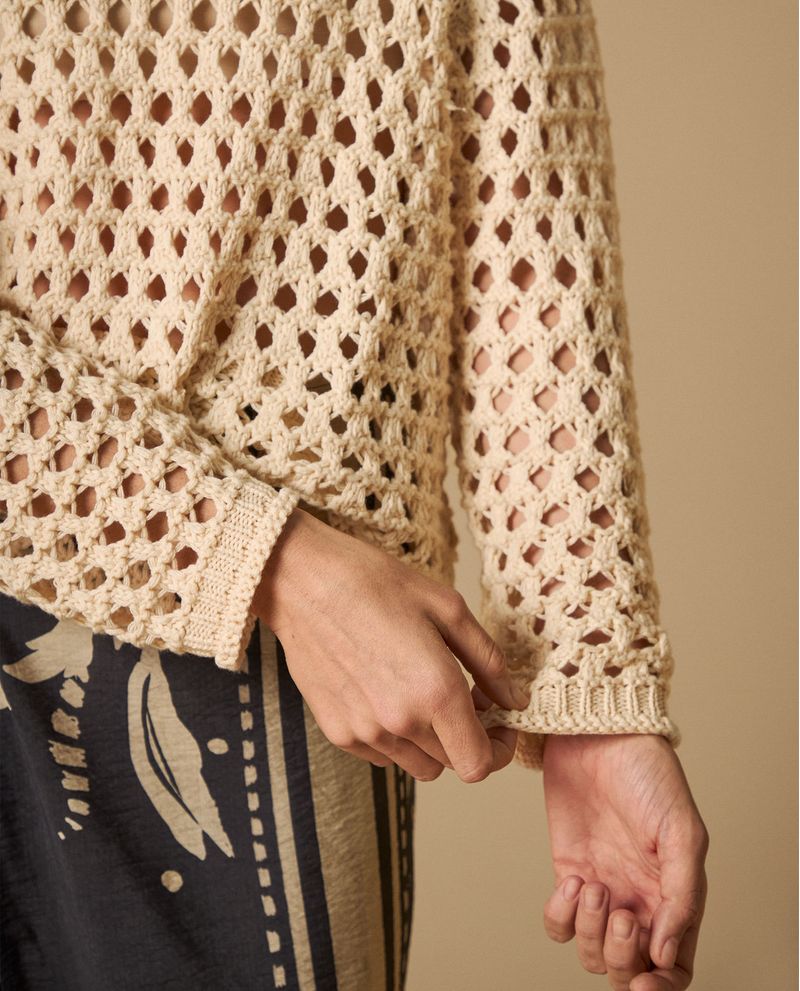 Este suéter tejido destaca por su patrón calado geométrico que crea un juego visual de transparencias mientras conserva la funcionalidad térmica característica del tejido. Su construcción artesanal combina técnica tradicional con diseño contemporáneo, logrando una prenda que aporta textura y movimiento sin comprometer la comodidad.