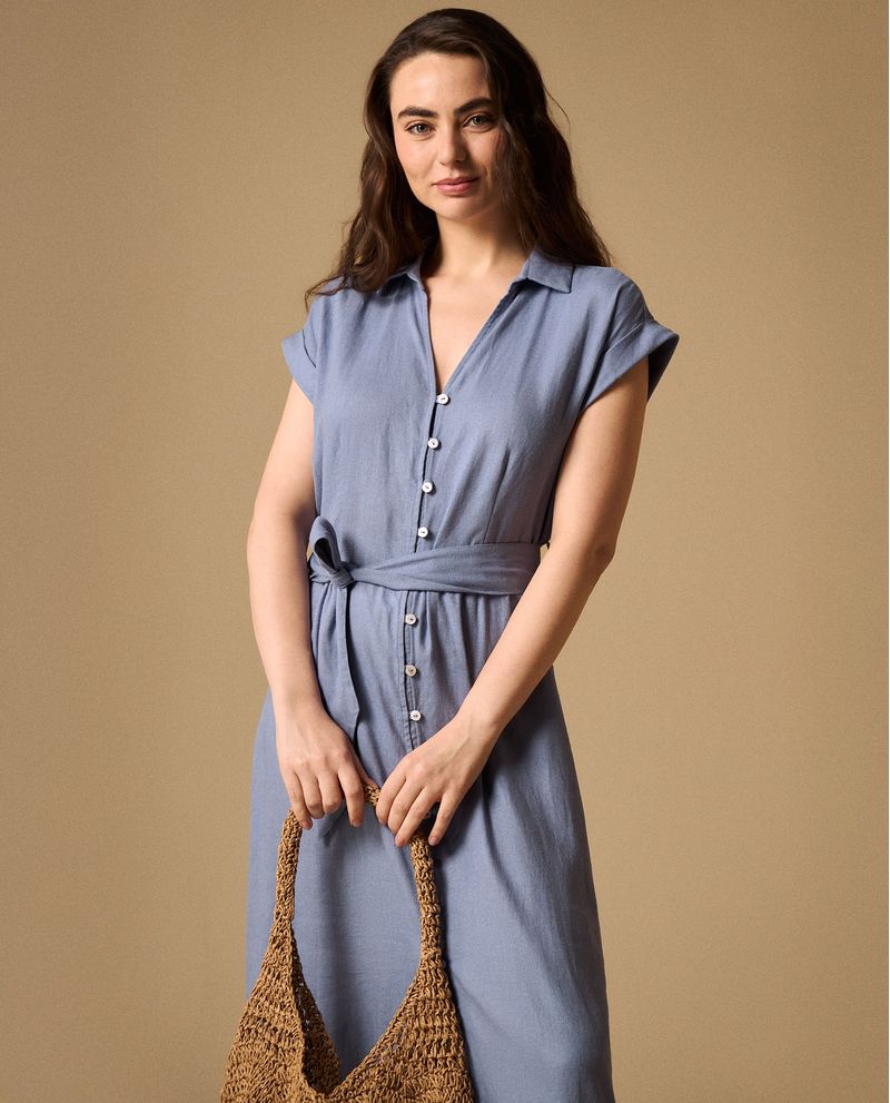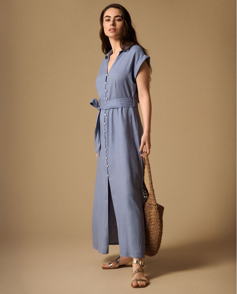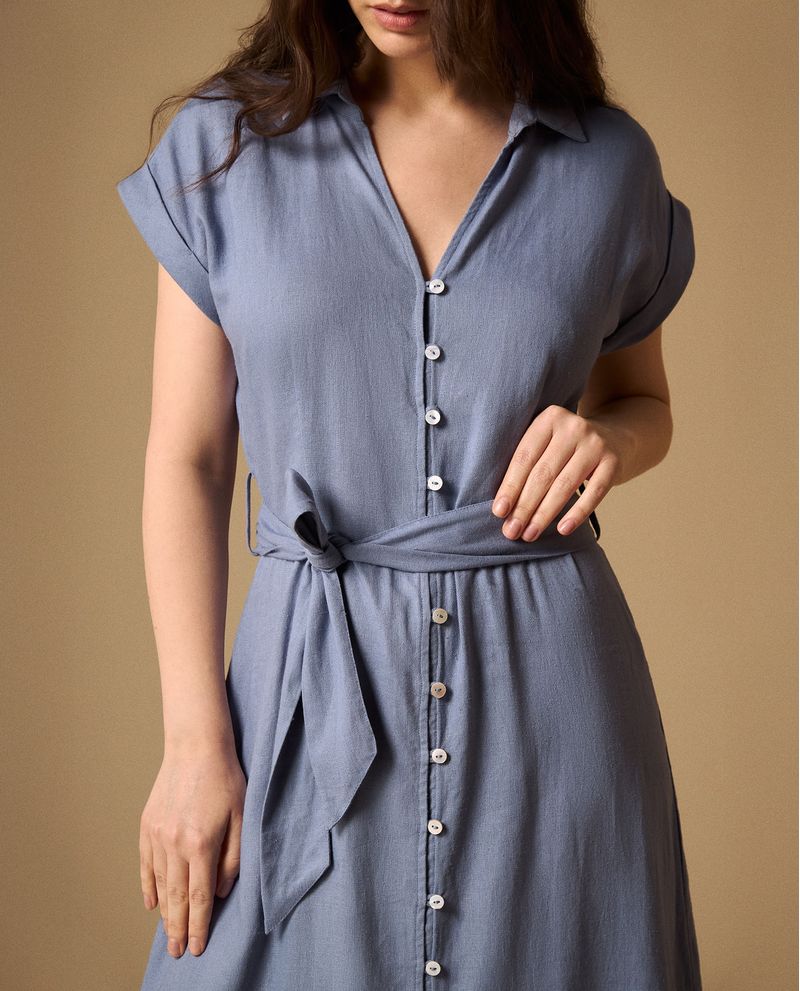 Vestido camisero azul medio en mezcla lino-viscosa que combina la frescura natural con una caída impecable, mientras que su botonadura completa y cinturón incluido definen una silueta favorecedora. Su diseño atemporal con cuello estructurado y manga corta con puño doblado lo convierte en la opción ideal para múltiples ocasiones, desde reuniones de trabajo hasta eventos casuales elegantes.