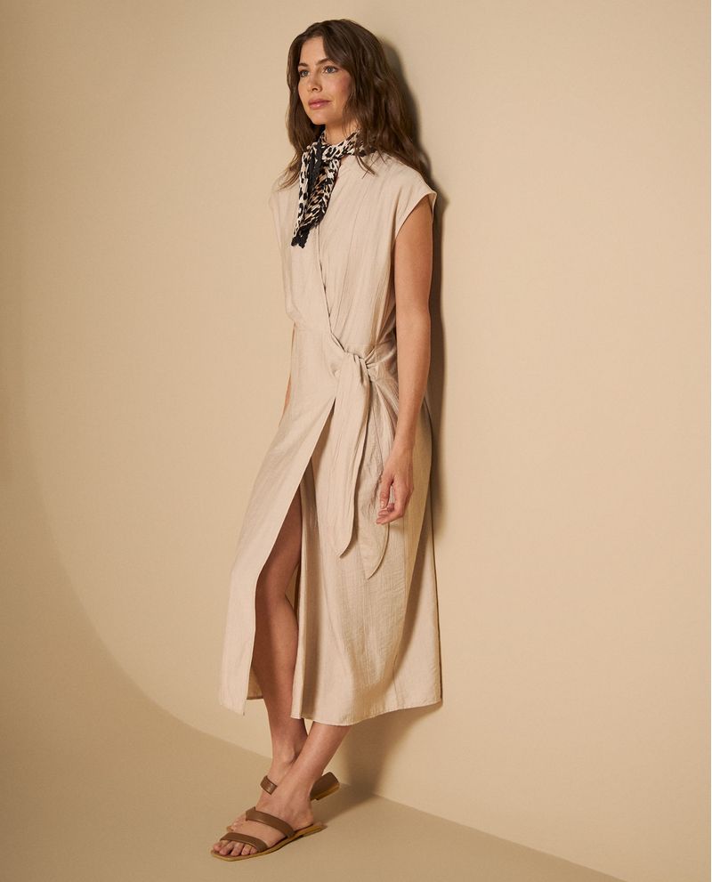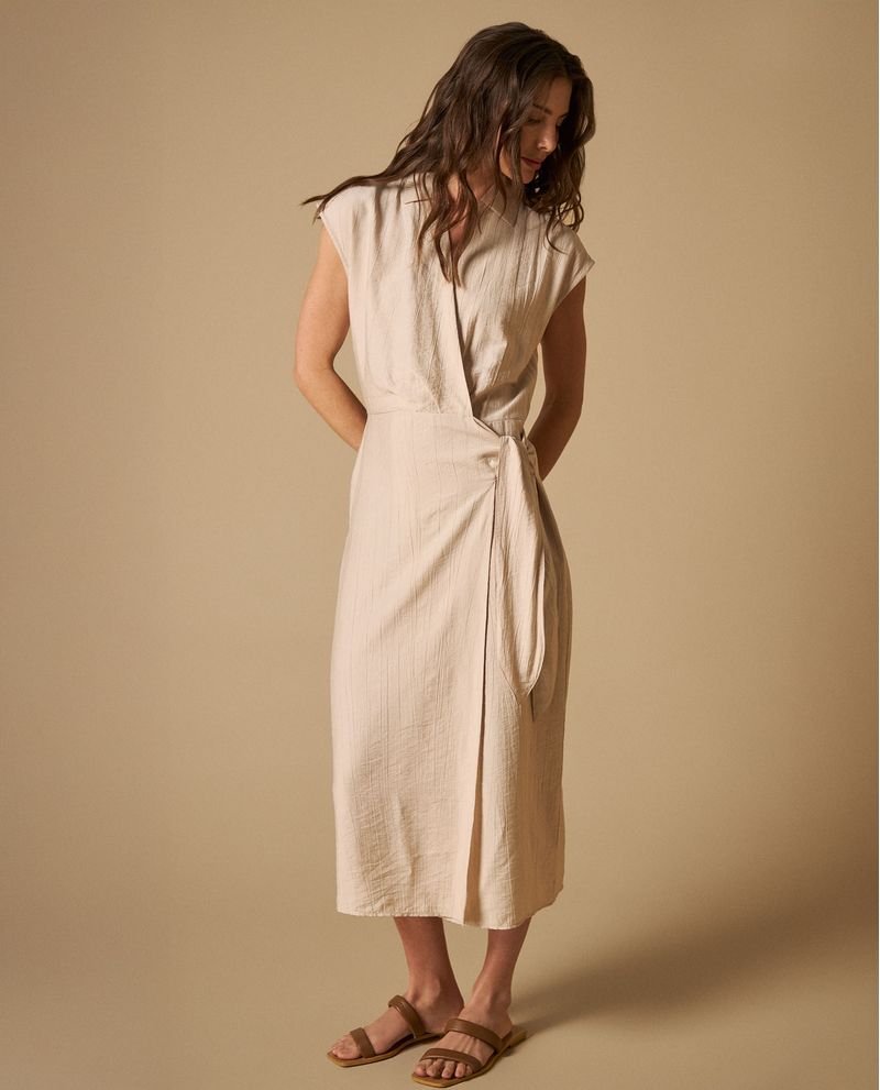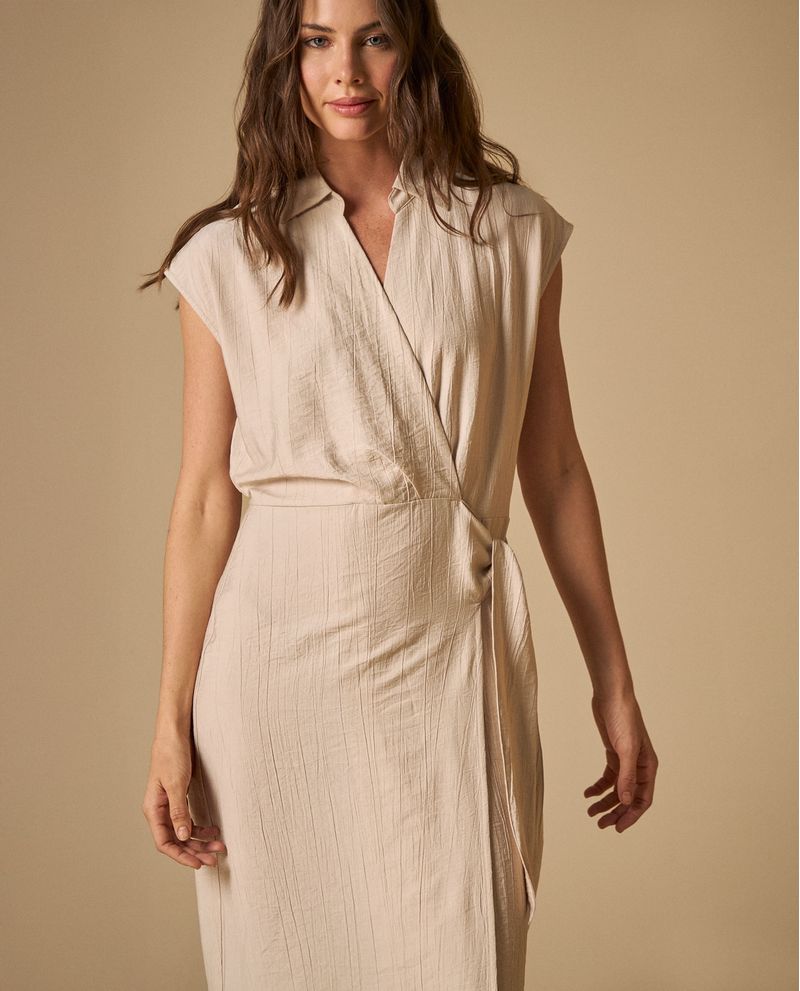 Vestido Camisero Midi con Cinturón Vestido beige tipo camisero con silueta midi y cinturón lateral ajustable, diseñado con cuello clásico y abertura frontal con botones que combinan elegancia formal con comodidad relajada. Su corte fluido se adapta naturalmente al cuerpo mientras que el cinturón define la cintura creando una silueta favorecedora, perfecto para transiciones de día a noche.