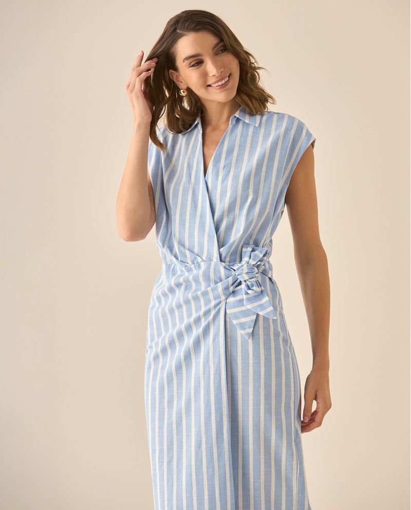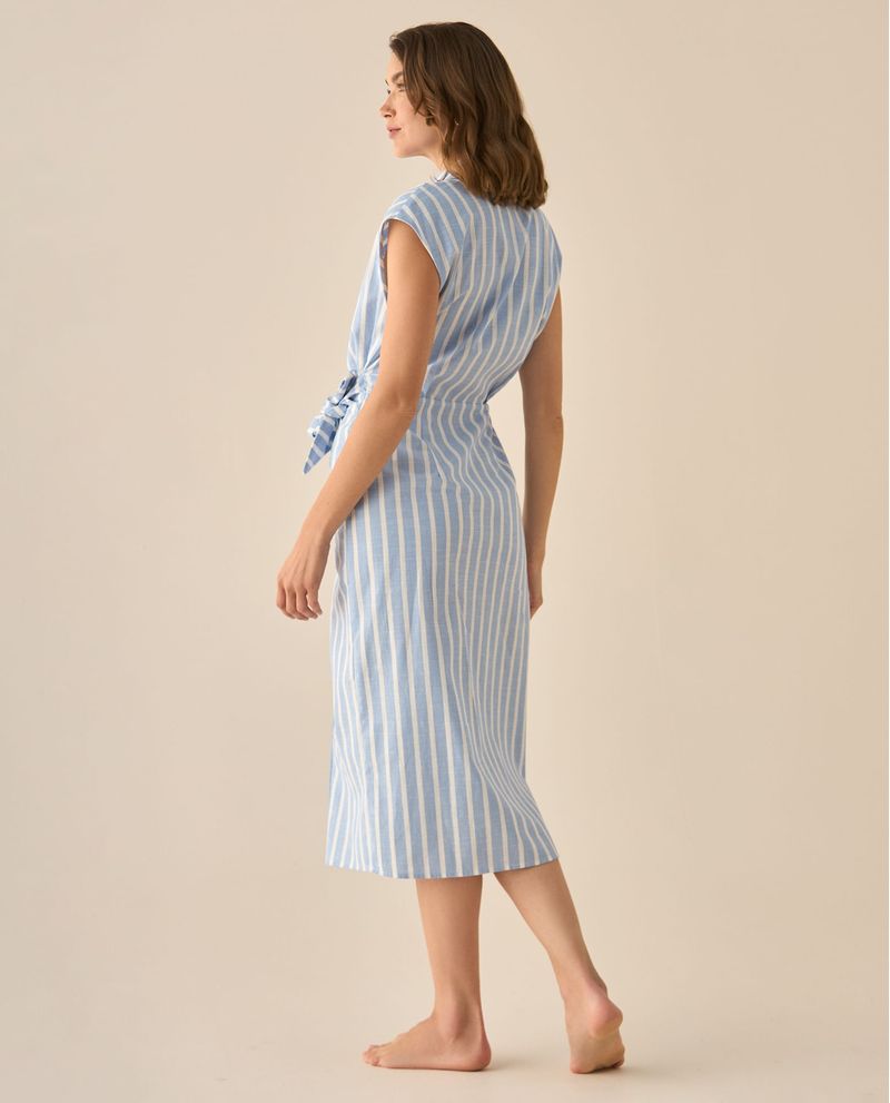 Ligereza, sofisticación y estilo. Este vestido largo con rayas verticales que estiliza visualmente, mientras su diseño cruzado y lazo lateral abrazan la silueta. El cuello clásico y las mangas sisa lo convierten en una opción fresca y atemporal para días largos llenos de encanto.
