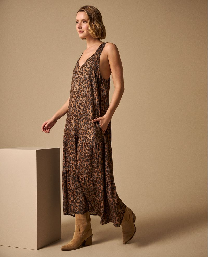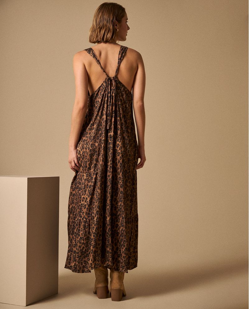Vestido maxi en beige con estampado leopardo sofisticado que combina elegancia natural con comodidad absoluta gracias a su tejido de viscosa fluida. Los tirantes cruzados en la espalda y los volantes escalonados crean una silueta favorecedora que se adapta a múltiples ocasiones, desde brunches casuales hasta cenas especiales.