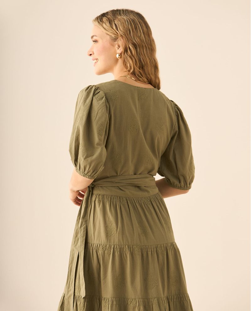 Un vestido que lo tiene todo: largo, fluido y con diseño cruzado. Esta pieza con escote en V, boleros en los cortes y puños elásticos en las mangas ofrece movimiento y frescura. Su ruedo con malla interna y bordados tono a tono lo convierten en una pieza de ensueño para ocasiones especiales o días que merecen sentirse únicos.