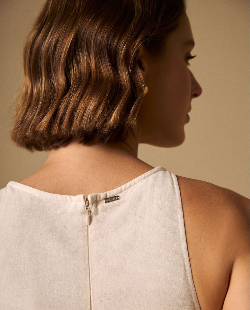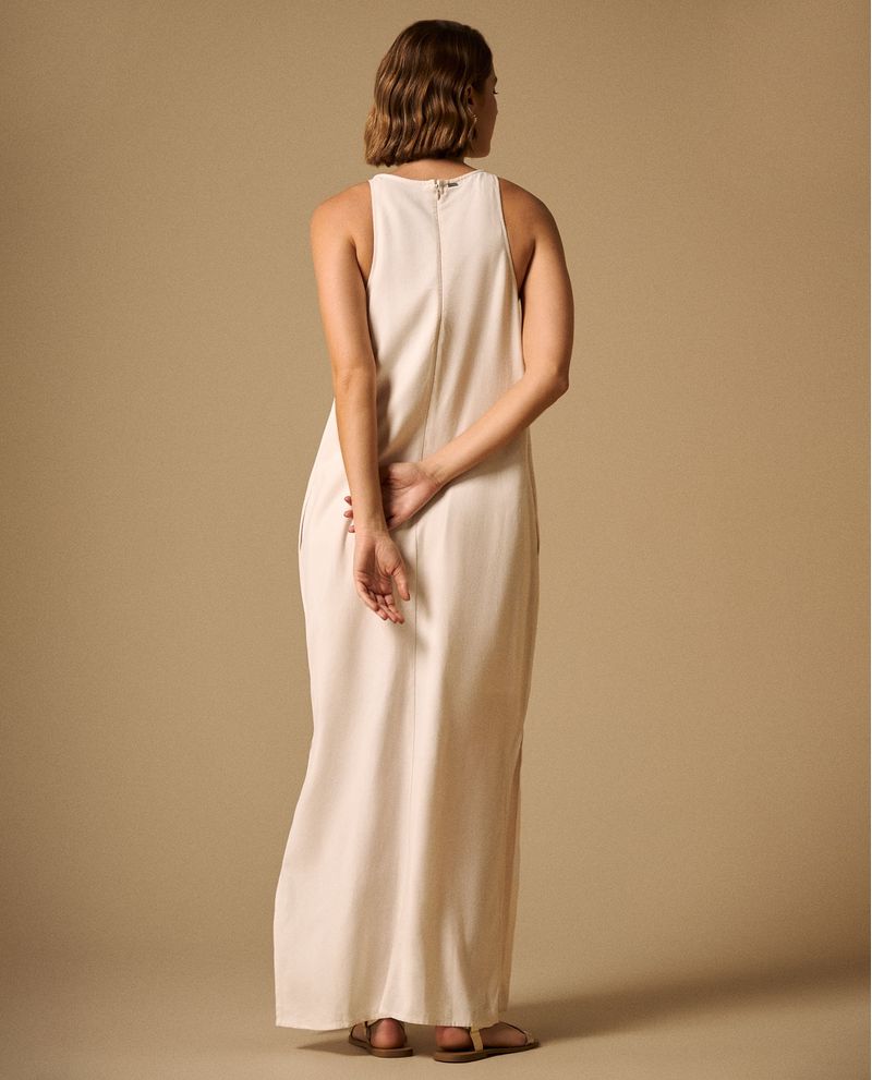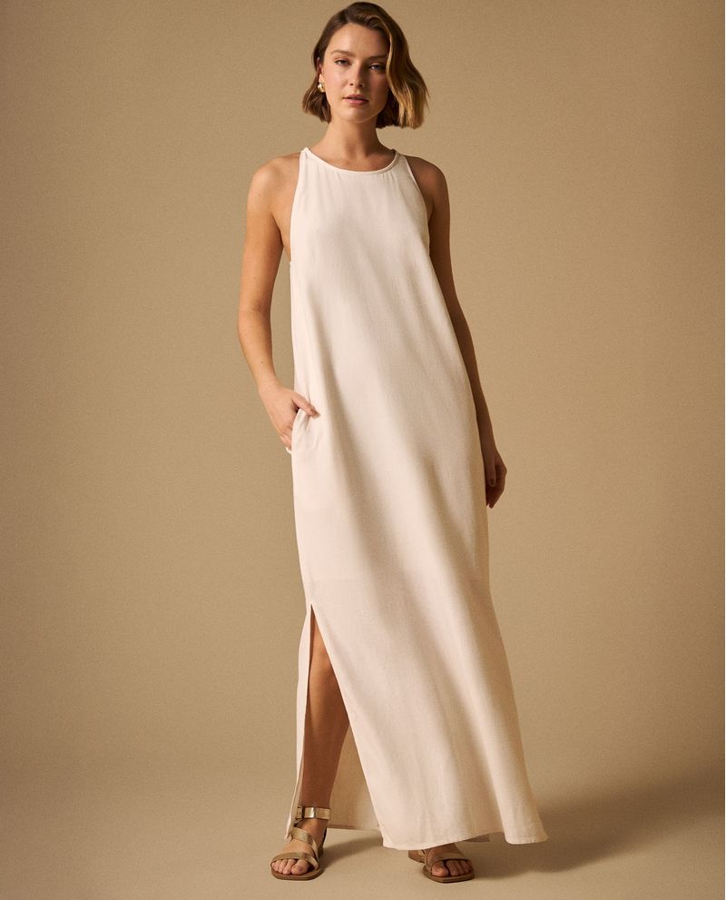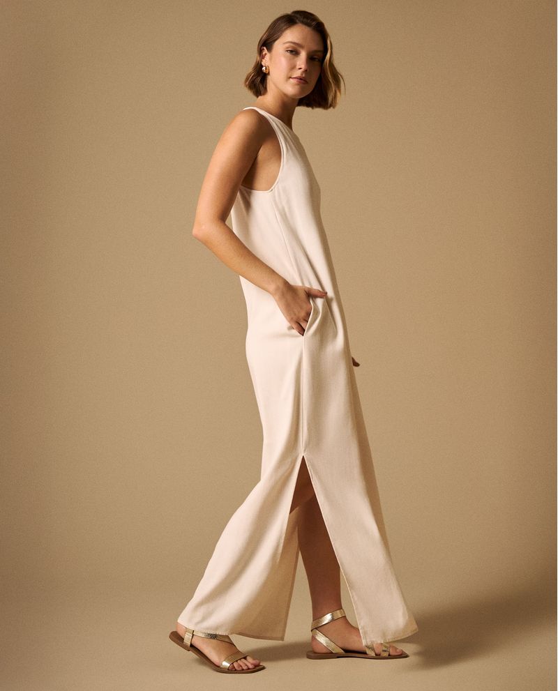 Vestido blanco maxi con mezcla de viscosa y lino que ofrece caída fluida y frescura natural, además cuenta con forro completo de rayón que garantiza comodidad y opacidad. Su abertura lateral añade movimiento elegante mientras que el cierre posterior invisible mantiene líneas limpias. Diseñado para ocasiones especiales donde la elegancia relajada es clave.