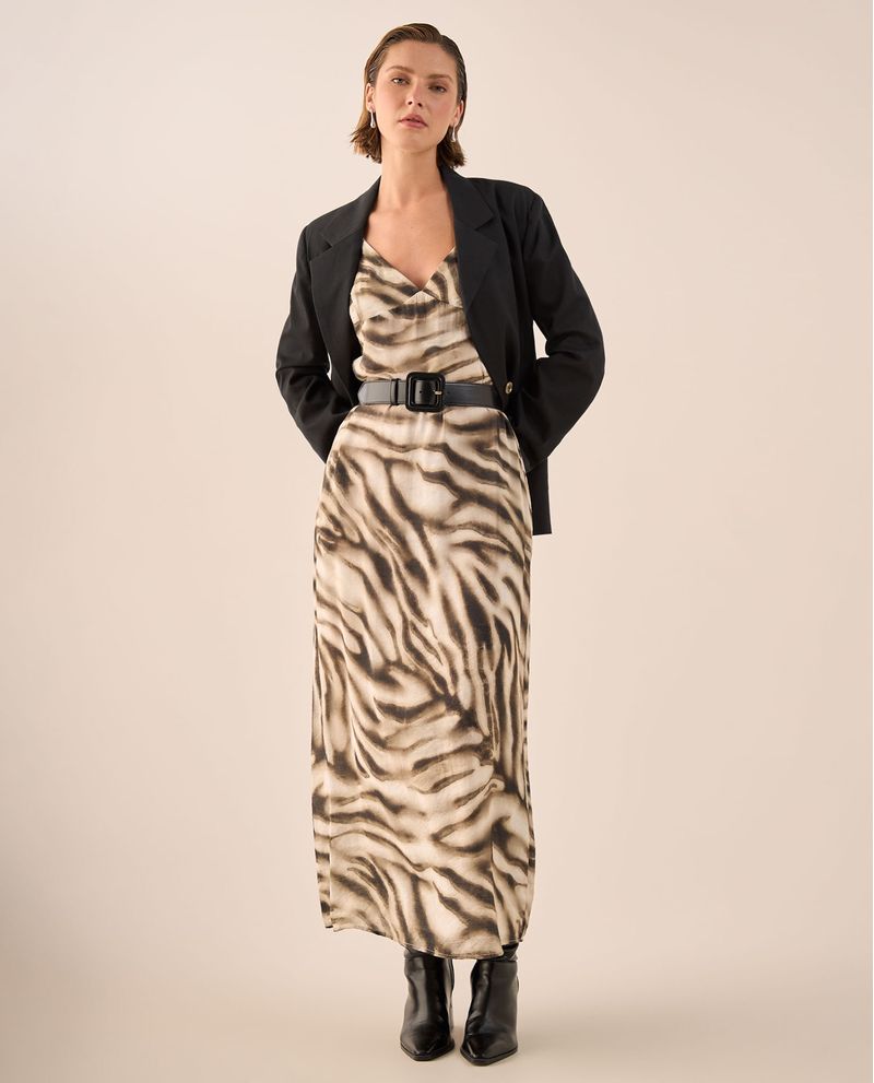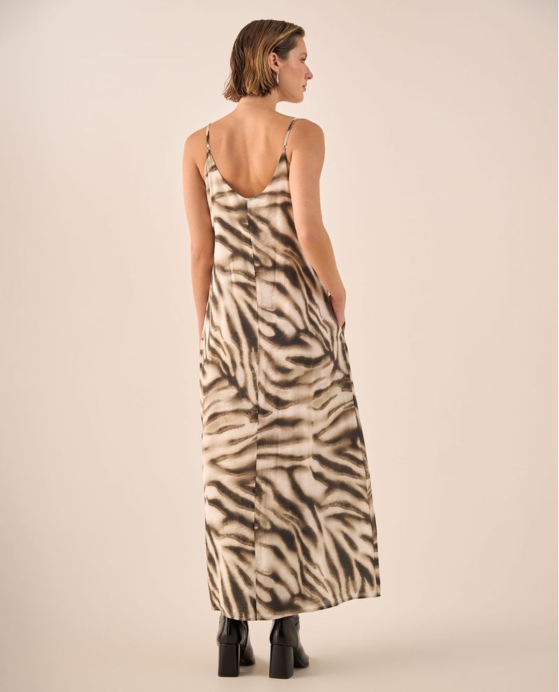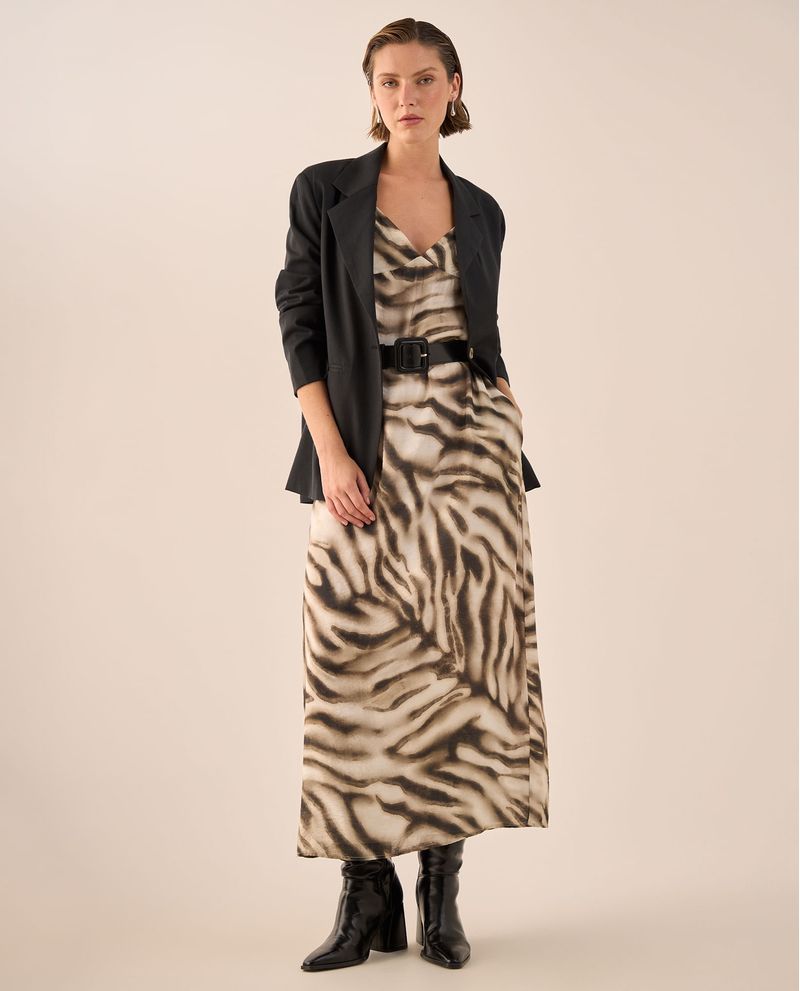 Vestido midi gris con estampado animal abstracto que combina la fluidez natural de la viscosa con tirantes ajustables y escote drapeado. Su forro completo asegura comodidad total, mientras que la caída fluida crea una silueta elegante. Perfecto para eventos especiales, cenas importantes y ocasiones donde buscas destacar con sofisticación. La mezcla de viscosa y poliamida mantiene su forma y movimiento natural con cada paso.