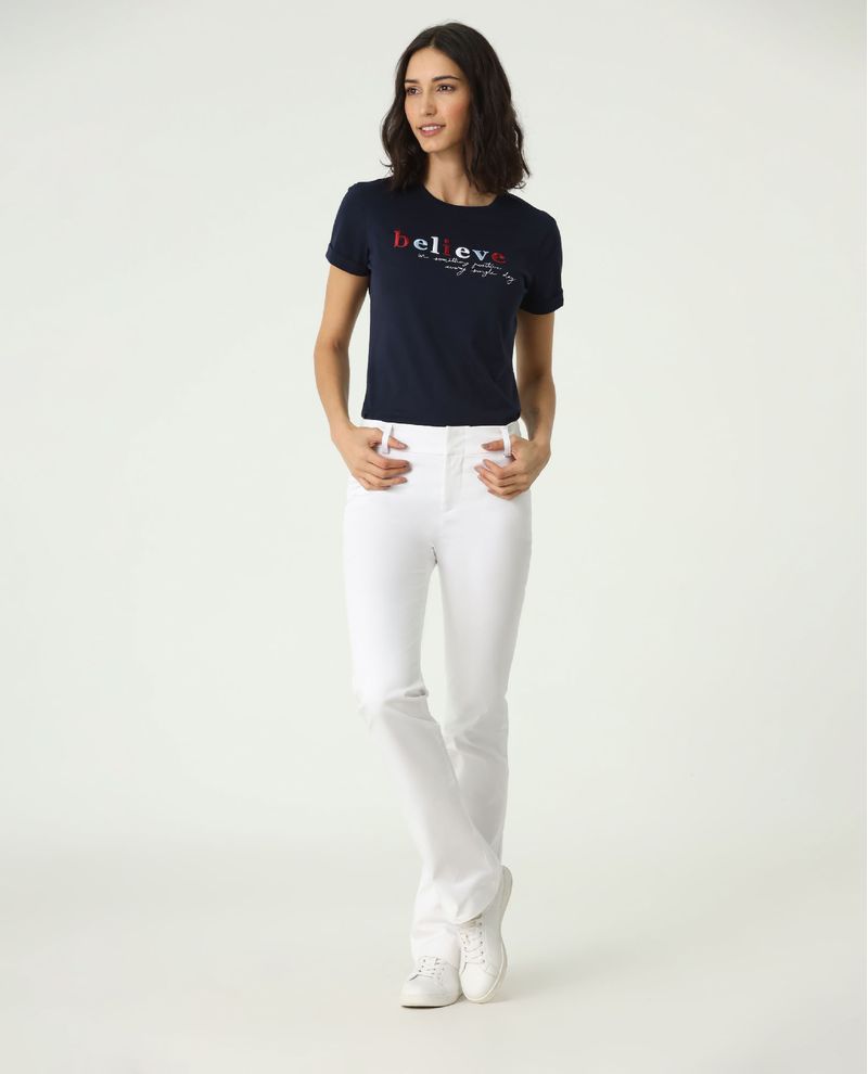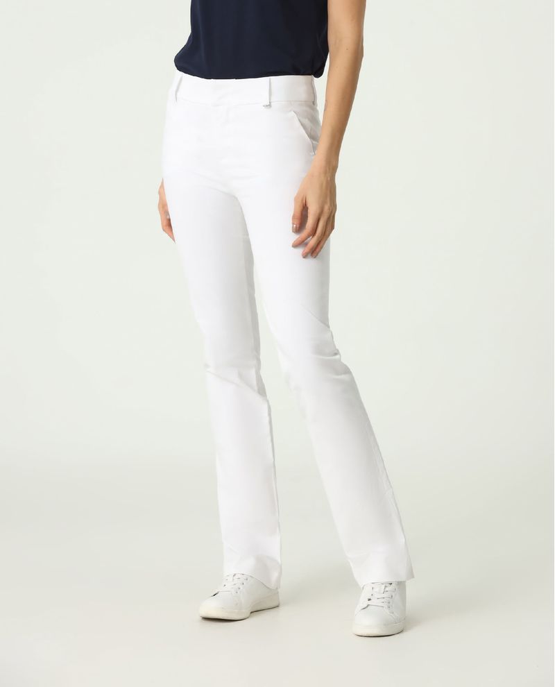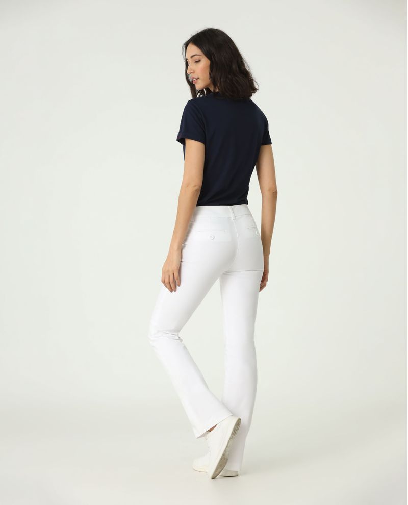 Pantalón tiro medio, bota flare. Pretina con trabillas y ajuste con cremallera y broche interno. Bolsillos laterales en diagonal y bolsillos de ribete con botón atrás. Incluye correa delgada con hebilla metálica. Este pantalón sencillo presenta un diseño clásico con pierna ligeramente acampanada que resulta versátil y muy favorecedor. Gracias a su look atemporal podrás usarlo tanto para la oficina como para looks más desenfadados.